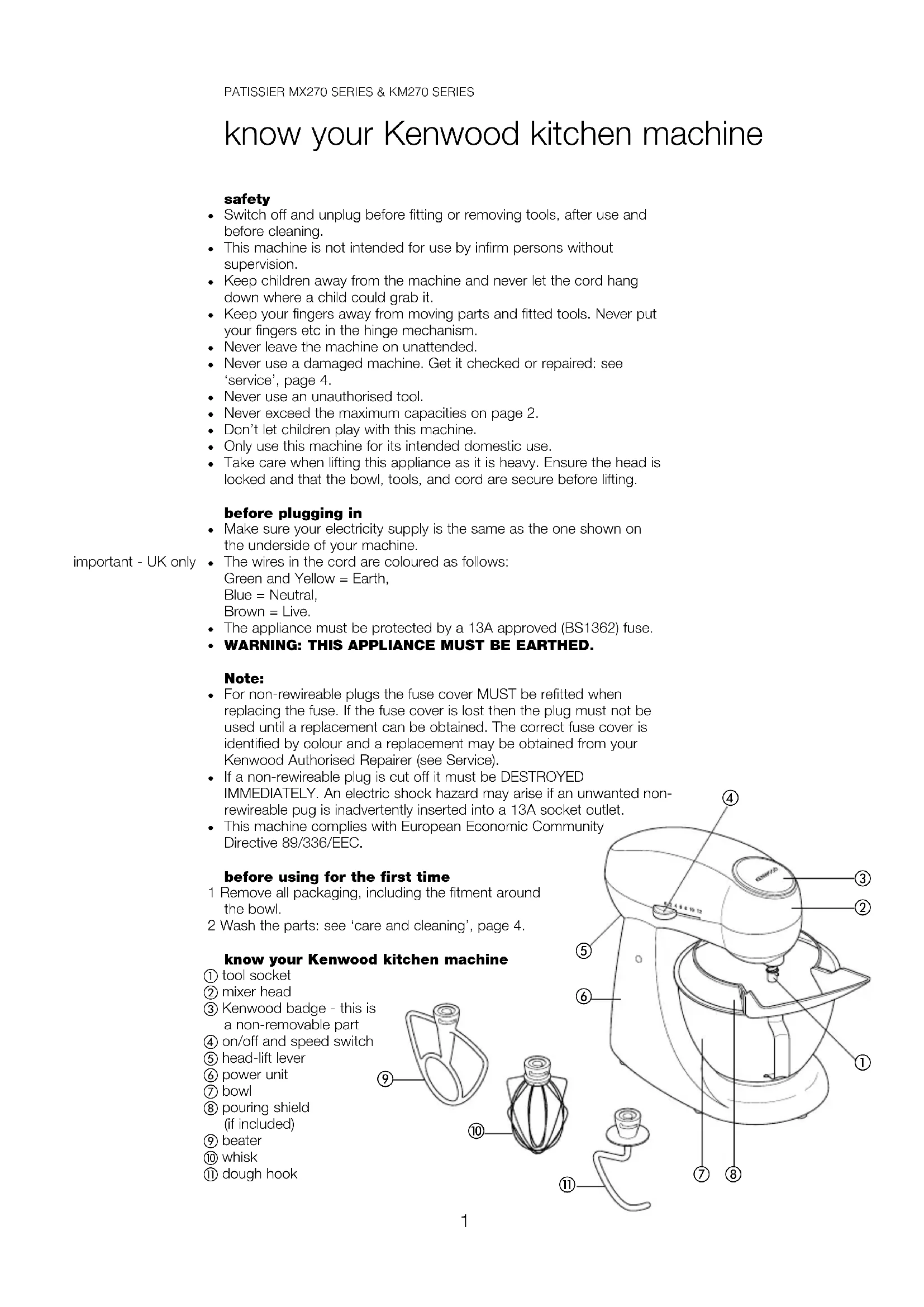 This machine complies with European Economic Community Directive 89/336/EEC. before using for the first time 1 Remove all packaging, including the fitment around the bowl. 2 Wash the parts: see ‘care and cleaning’, page 4. know your Kenwood kitchen machine tool socket mixer head Kenwood badge - this is a non-removable part on/off and speed switch head-lift lever power unit bowl pouring shield (if included) beater whisk dough hook