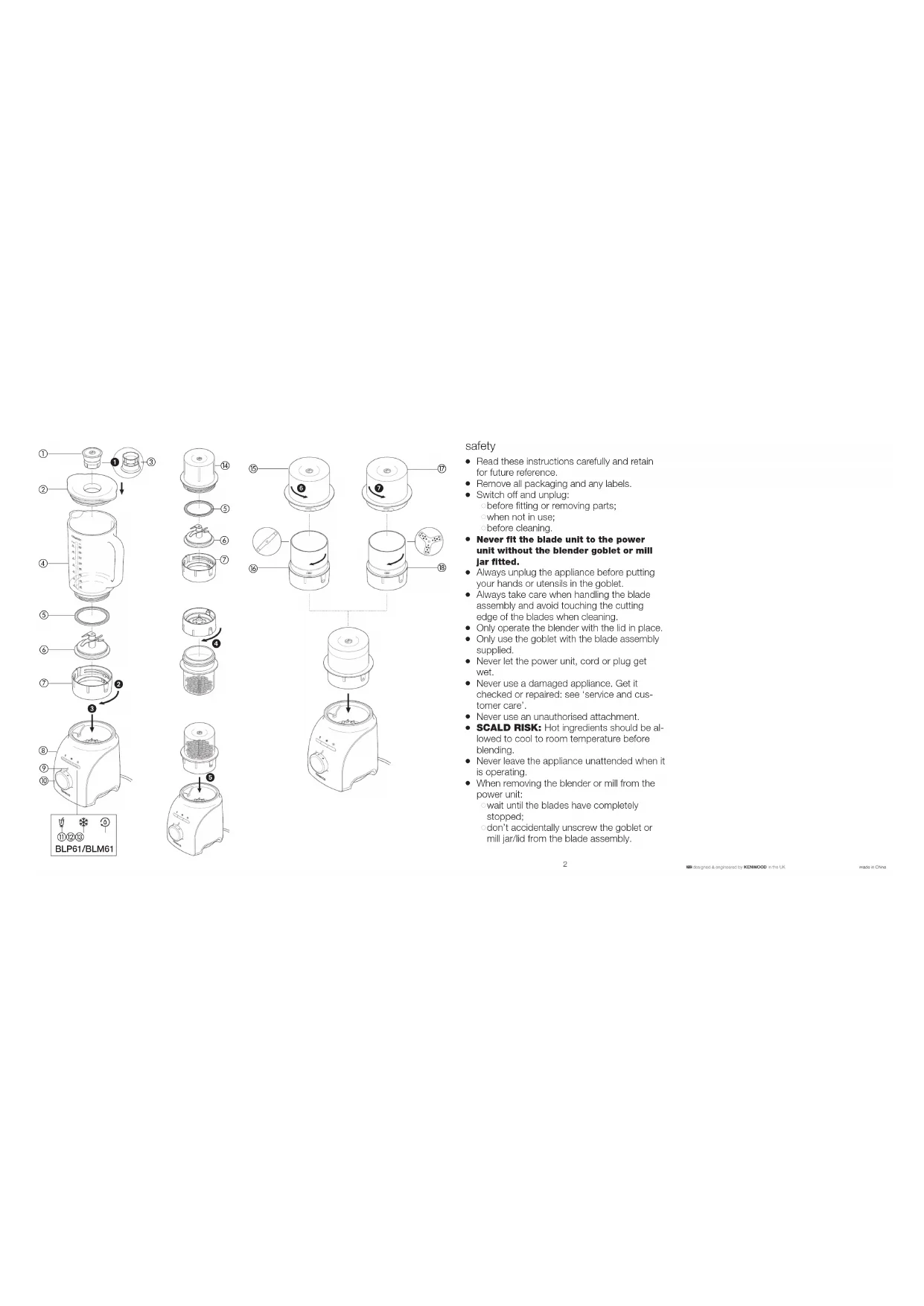 orrectly. fully tightened to the goblet. Power On Light flashing The blender has Turn the speed slowly. been left plugged in and control to the (BLP61/BLM61 only) in the ‘on’ position for “O” OFF position, more than 15 minutes wait 5 seconds and and has gone into then turn to “on” to standby mode. reset. BLP61/BLM61 Blender not Goblet fitted and speed Either select a speed operating but Power On control turned to “on” but manually or press and programme button speed or programme one of the lights on. not selected. programme buttons. Power on light flashing The goblet is removed Turn the speed rapidly (BLP61/BLM61 only) from the power unit control to “O” OFF without turning the speed and reselect a control to “O” OFF. speed. Programme buttons not Programme buttons will Turn the speed operating not operate unless the control to “on” and speed control is turned to select the required the “on” position first. programme. Blender leaking from blade Seal missing. Check seal is fitted assembly. Seal incorrectly fitted. correctly and not Seal damaged. damaged. To obtain a replacement seal see “service & customer care”. Blender seal missing from The seal is packed Unscrew goblet and blade unit when removed pre-fitted to the blade check that seal is from packaging. unit. fitted to blade unit. To obtain a replacement seal see “service & customer care”. If none of the above solve the problem see “Service & Customer Care”.veiligheid