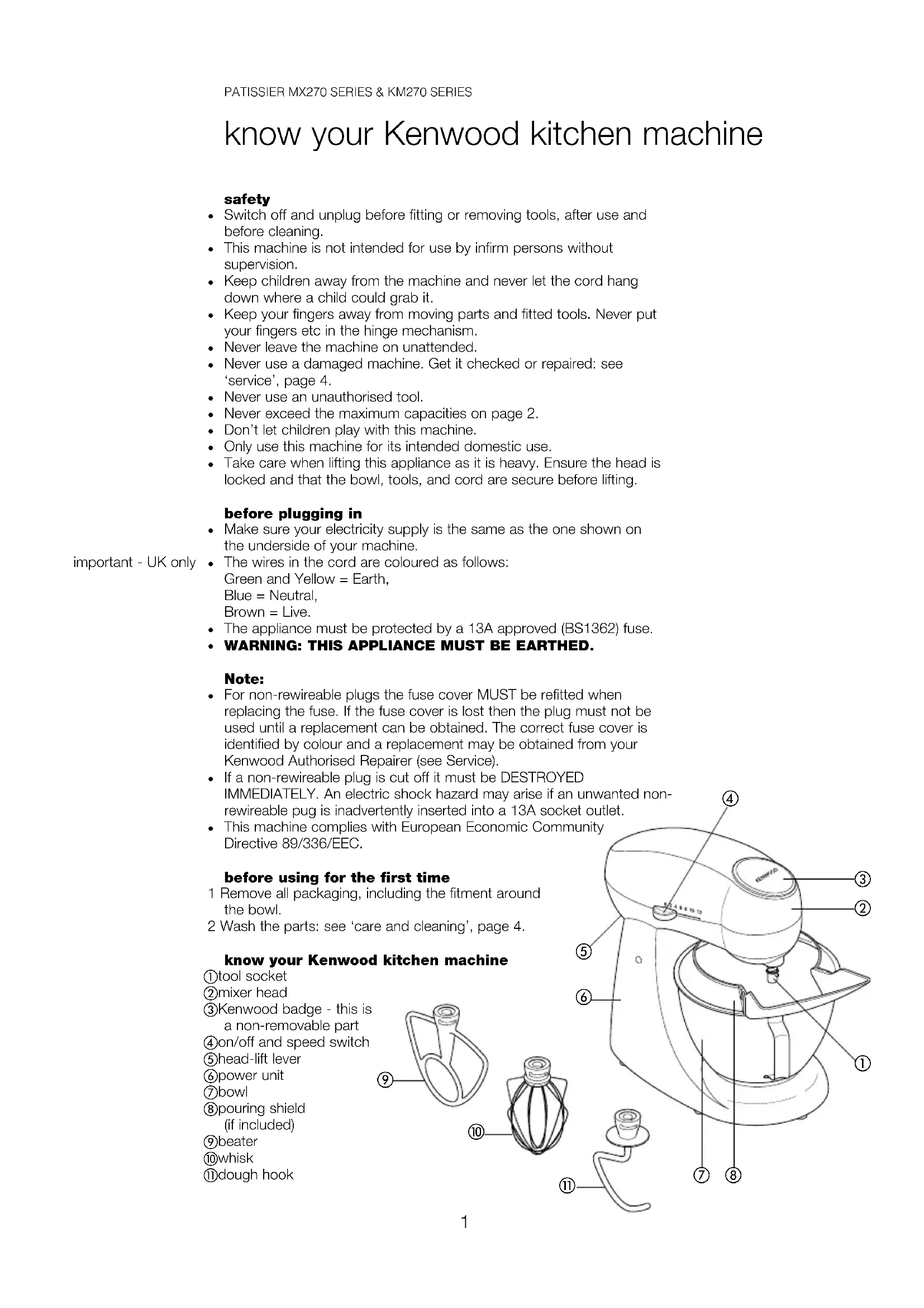 This machine complies with European Economic Community Directive 89/336/EEC. before using for the first time 1 Remove all packaging, including the fitment around the bowl. 2 Wash the parts: see ‘care and cleaning’, page 4. know your Kenwood kitchen machine tool socket mixer head Kenwood badge - this is a non-removable part on/off and speed switch head-lift lever power unit bowl pouring shield (if included) beater whisk dough hook