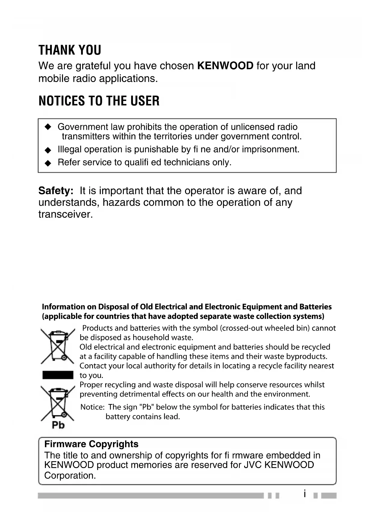 Refer service to qualifi ed technicians only. Safety: It is important that the operator is aware of, and understands, hazards common to the operation of any transceiver. Firmware Copyrights The title to and ownership of copyrights for fi rmware embedded in KENWOOD product memories are reserved for JVC KENWOOD Corporation. Information on Disposal of Old Electrical and Electronic Equipment and Batteries (applicable for countries that have adopted separate waste collection systems) Products and batteries with the symbol (crossed-out wheeled bin) cannot be disposed as household waste. Old electrical and electronic equipment and batteries should be recycled at a facility capable of handling these items and their waste byproducts. Contact your local authority for details in locating a recycle facility nearest to you. Proper recycling and waste disposal will help conserve resources whilst preventing detrimental effects on our health and the environment. Notice: The sign "Pb" below the symbol for batteries indicates that this battery contains lead.ii PRECAUTIONS