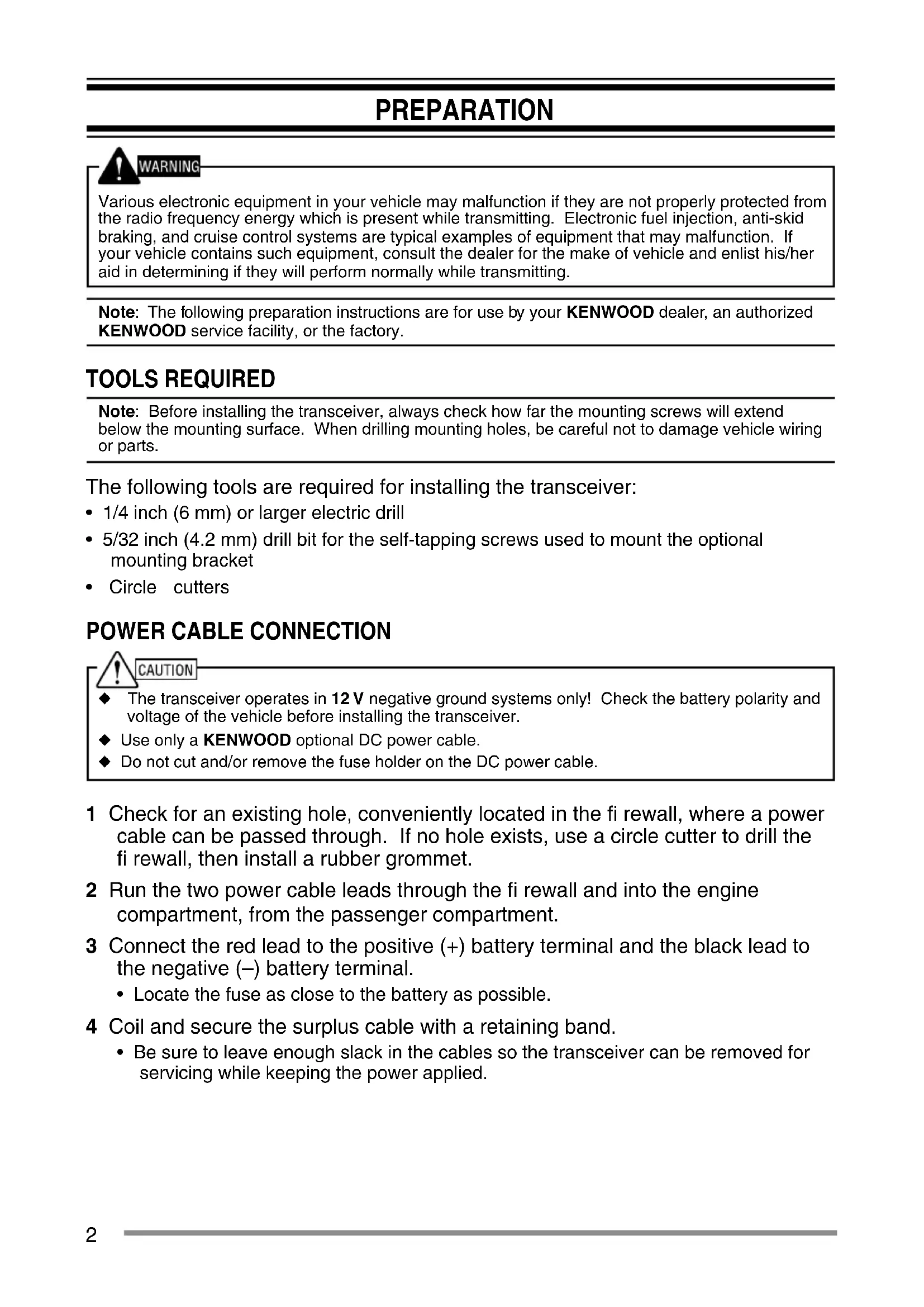 - Instruction manual . . . . . . . . . . . . . . . . . . . . . . . . . . . . . . . . . . . . . . . . . . . . . 12 PREPARATION Various electronic equipment in your vehicle may malfunction if they are not properly protected from the radio frequency energy which is present while transmitting. Electronic fuel injection, anti-skid braking, and cruise control systems are typical examples of equipment that may malfunction. If your vehicle contains such equipment, consult the dealer for the make of vehicle and enlist his/her aid in determining if they will perform normally while transmitting. Note: The following preparation instructions are for use by your KENWOOD dealer, an authorized KENWOOD service facility, or the factory. TOOLS REQUIRED Note: Before installing the transceiver, always check how far the mounting screws will extend below the mounting surface. When drilling mounting holes, be careful not to damage vehicle wiring or parts. The following tools are required for installing the transceiver: