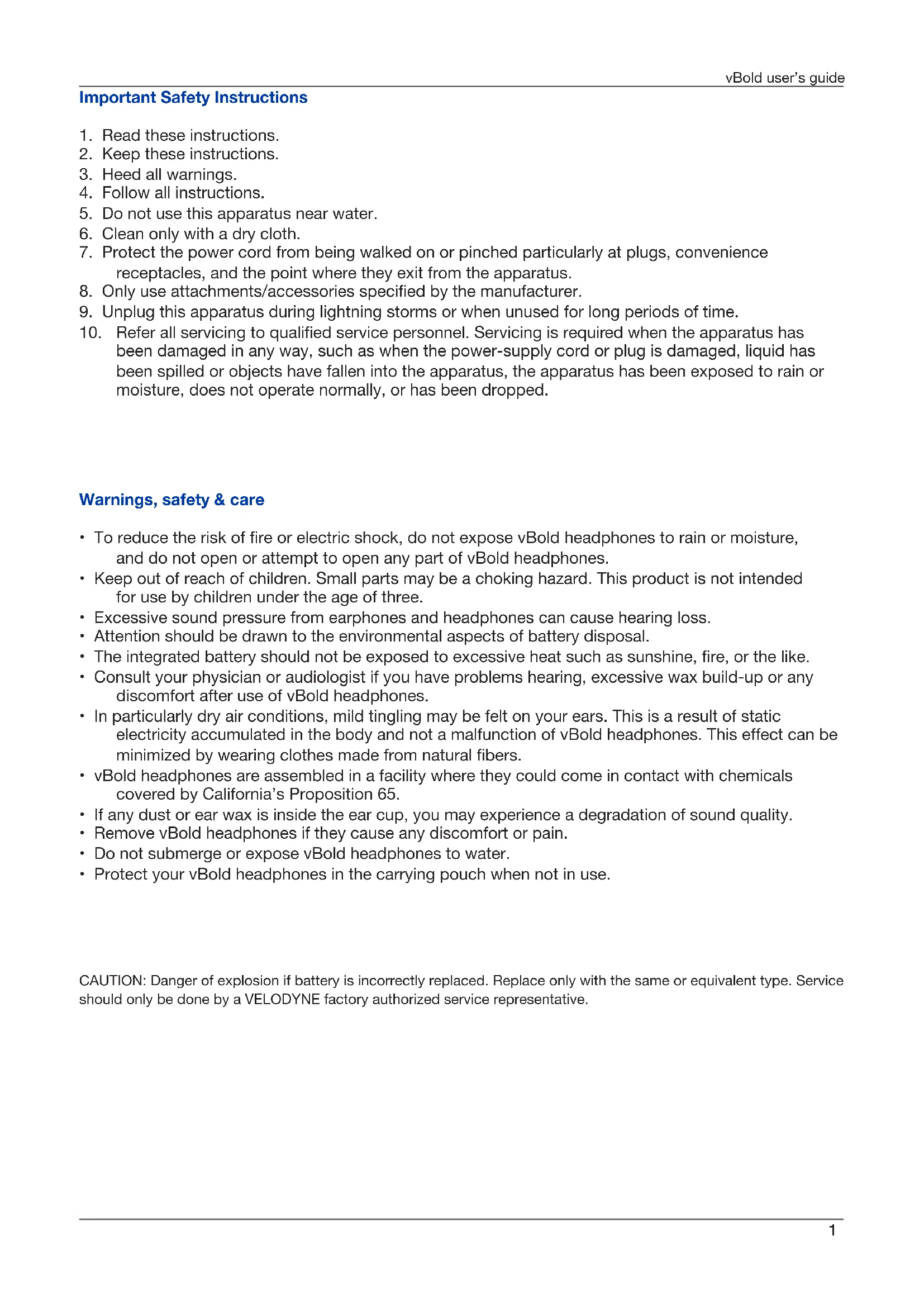 - Do not submerge or expose vBold headphones to water.