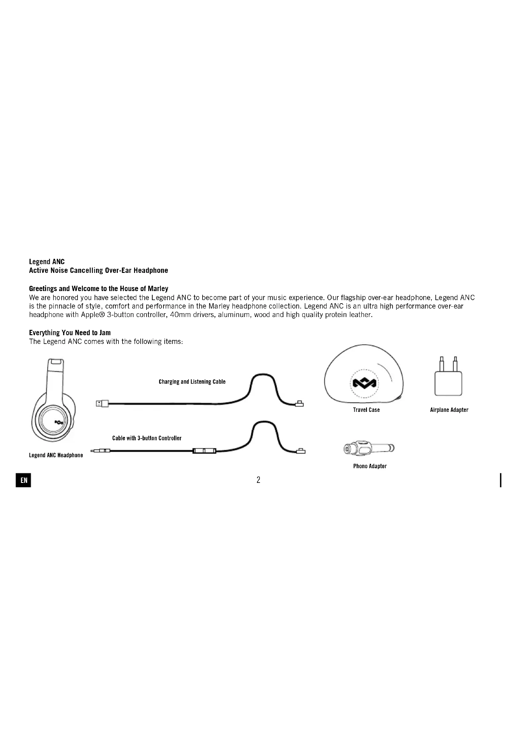 Legend ANC2 Legend ANC Active Noise Cancelling Over-Ear Headphone Greetings and Welcome to the House of Marley We are honored you have selected the Legend ANC to become part of your music experience. Our flagship over-ear headphone, Legend ANC is the pinnacle of style, comfort and performance in the Marley headphone collection. Legend ANC is an ultra high performance over-ear headphone with Apple® 3-button controller, 40mm drivers, aluminum, wood and high quality protein leather. Everything You Need to Jam The Legend ANC comes with the following items: Legend ANC Headphone Cable with 3-button Controller Charging and Listening Cable Travel Case Phono Adapter Airplane Adapter EN3 Enjoying Your Legend ANC Legend ANC headphones can be used with the ANC feature “ON” or “OFF”. To turn the active noise-cancelling feature “ON”, slide the switch located on your right ear cup upward. The light will illuminate to show that ANC is active. The technology inside your Legend ANC will actively cancel out unwanted outside noise while providing the detail and power your music deserves. During the “ON” sequence the battery indicator LED’s will illuminate to show the battery level. Charging your Device Use the charging cable included or any standard Micro-USB cable to charge Legend ANC. It can be charged from a computer’s USB port or a USB charging adapter. Battery Replacement Your Legend ANC includes a rechargeable battery designed to last the lifetime of the product. In the unlikely event that you should require a replacement battery please contact Customer Services who will supply details of the warranty and out-of-warranty replacement battery service. Compatibility of Microphone and Three-Button Control Integrated microphone allows for hands free conversations. Push the button to answer a call; push it again to end the call. Tracking and play/pause functions as shown on the illustration work with Apple devices only. x1 x1
