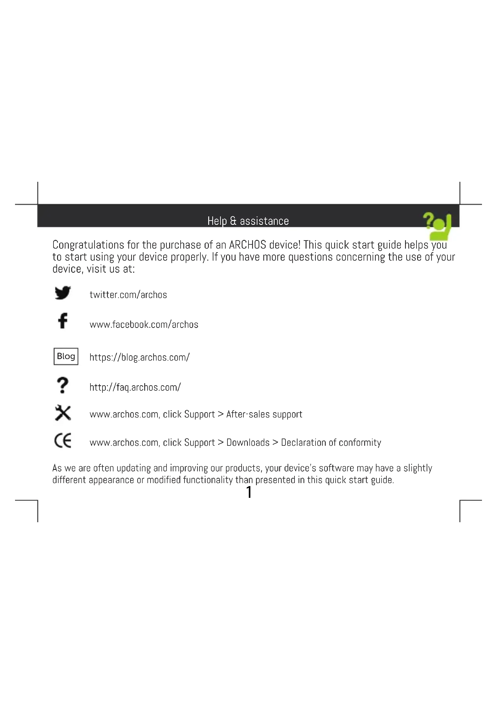 Help & assistance Congratulations for the purchase of an ARCHOS device! This quick start guide helps you to start using your device properly. If you have more questions concerning the use of your device, visit us at: twitter.com/archos www.facebook.com/archos Blog https://blog.archos.com/ http://faq.archos.com/ www.archos.com, click Support > After-sales support www.archos.com, click Support > Downloads > Declaration of conformity As we are often updating and improving our products, your device’s software may have a slightly different appearance or modified functionality than presented in this quick start guide.2 Warranty Unboxing ARCHOS 55b Platinum Quick start guide Warranty, legal and safety notice Charging cable Charger adapter3 Describing your device Front camera Phone speaker Headphone jack Back camera Flash light ON/OFF Volume Back Home Recent apps Loudspeaker Micro-USB port4 After you have unpacked your mobile phone box: