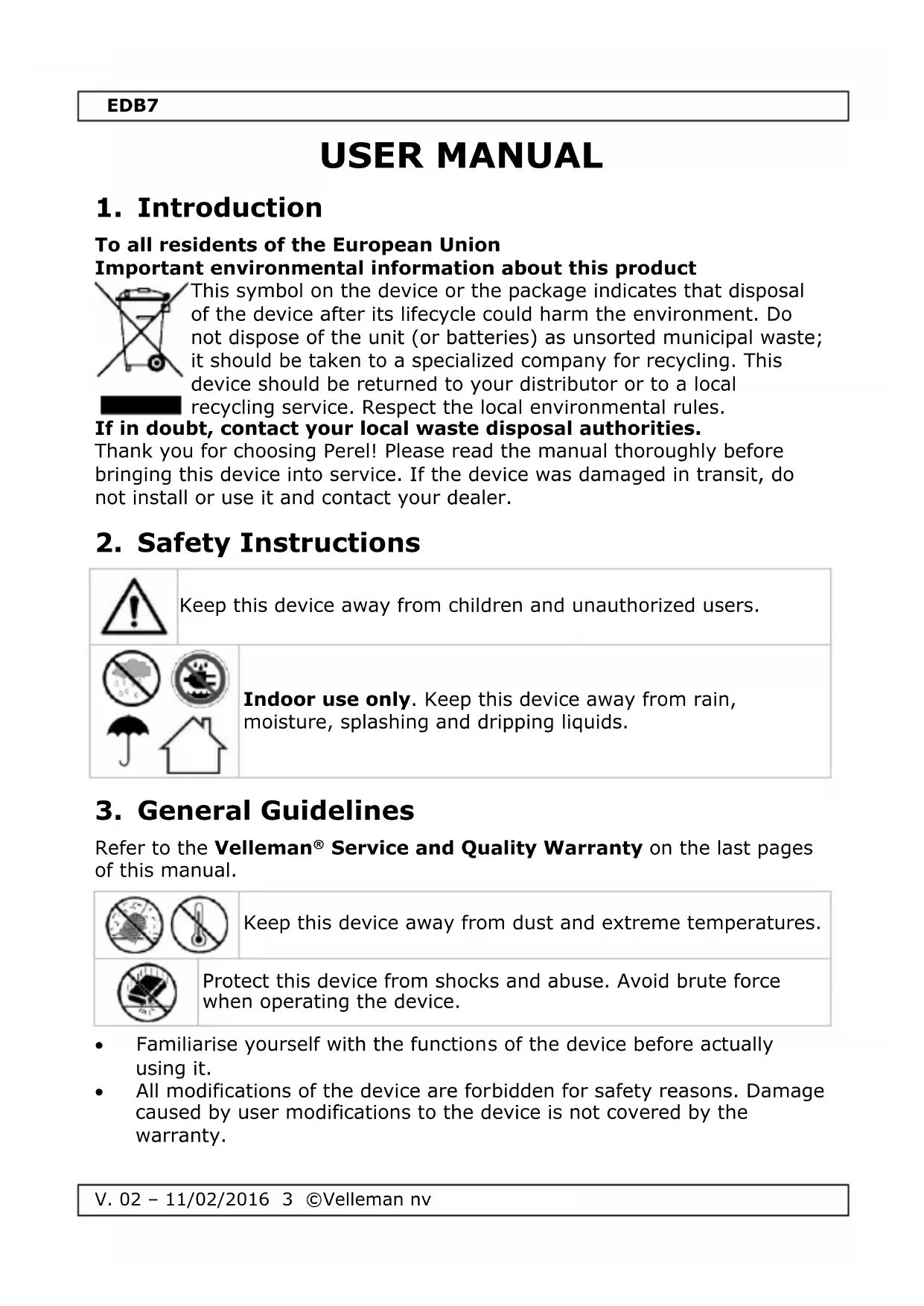 Use this device with original accessories only. Velleman nv cannot be held responsible in the event of damage or injury resulting from (incorrect) use of this device. For more info concerning this product and the latest version of this manual, please visit our website www.perel.eu. The information in this manual is subject to change without prior notice.EDB7