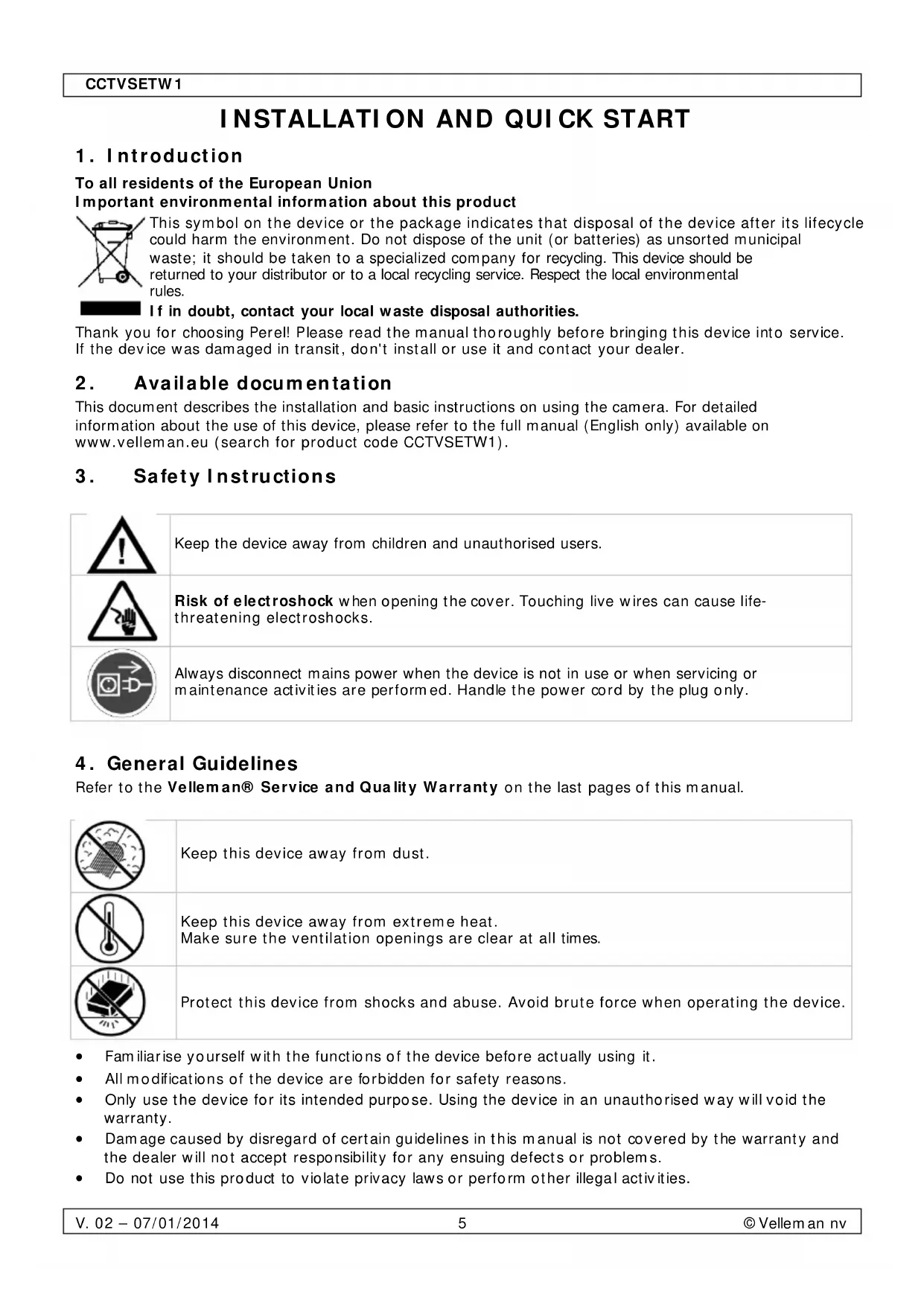 This document describes the installation and basic instructions on using the camera. For detailed information about the use of this device, please refer to the full manual (English only) available on www.velleman.eu (search for product code CCTVSETW1).