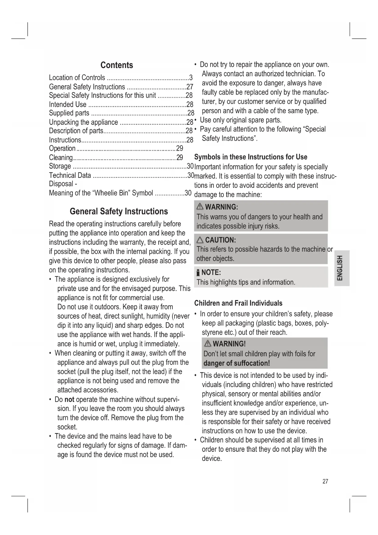 This warns you of dangers to your health and indicates possible injury risks. CAUTION: This refers to possible hazards to the machine or other objects. NOTE: This highlights tips and information. Children and Frail Individuals