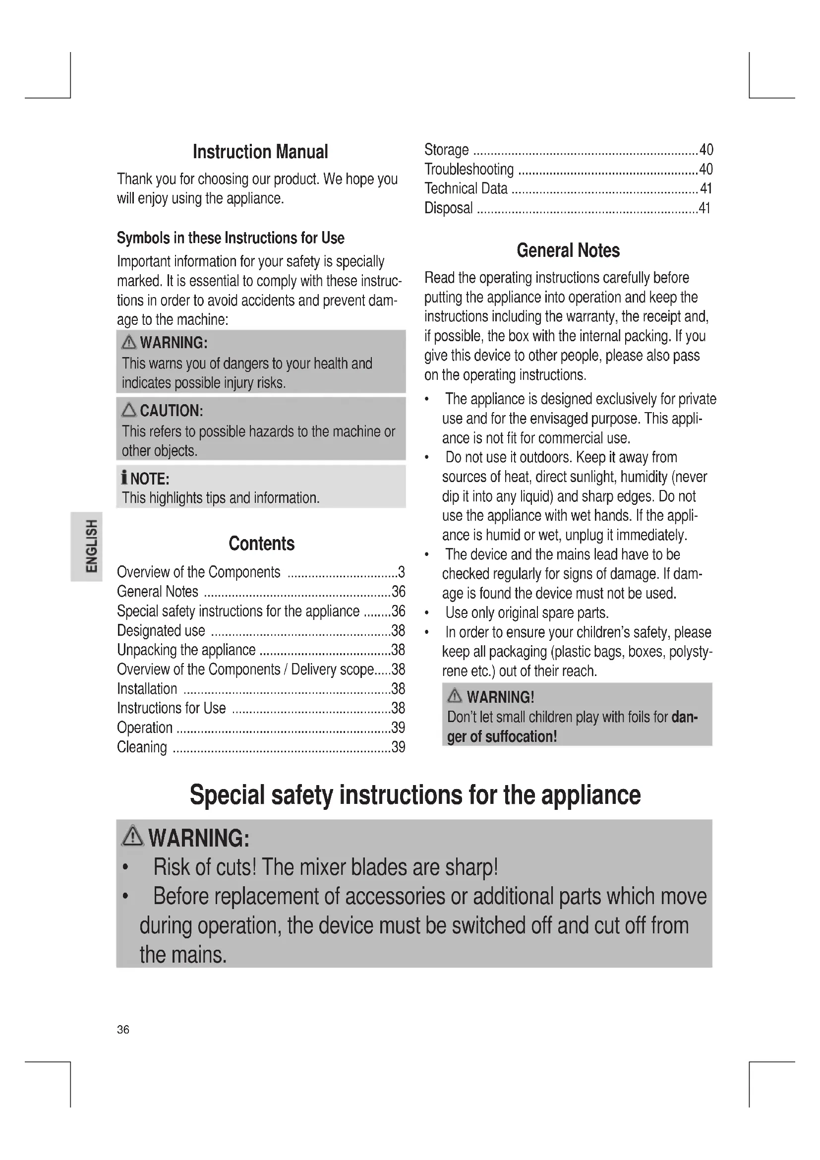 - Beforereplacementofaccessoriesoradditionalpartswhichmove during operation, the device must be switched off and cut off from the mains.37