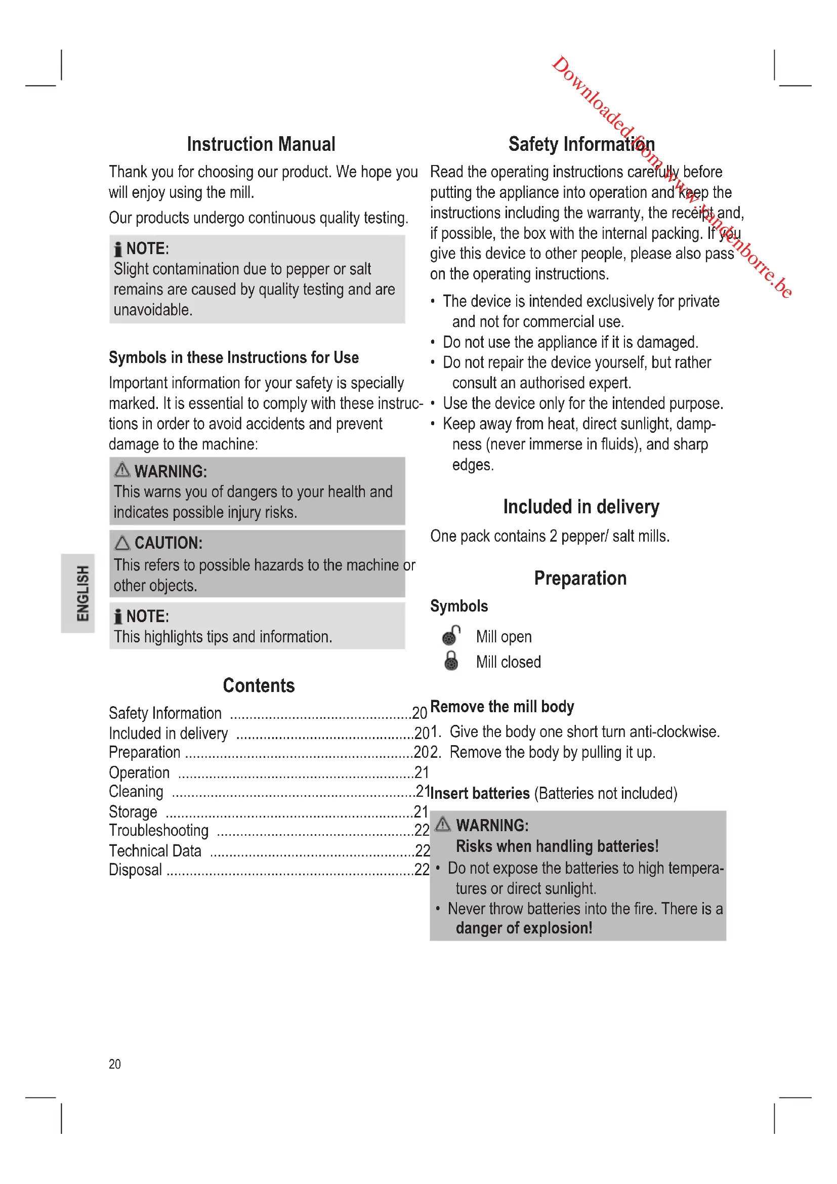 - Keep away from heat, direct sunlight, damp- ness (never immerse in uids), and sharp edges. Included in delivery One pack contains 2 pepper/ salt mills. Preparation Symbols Mill open Mill closed Remove the mill body