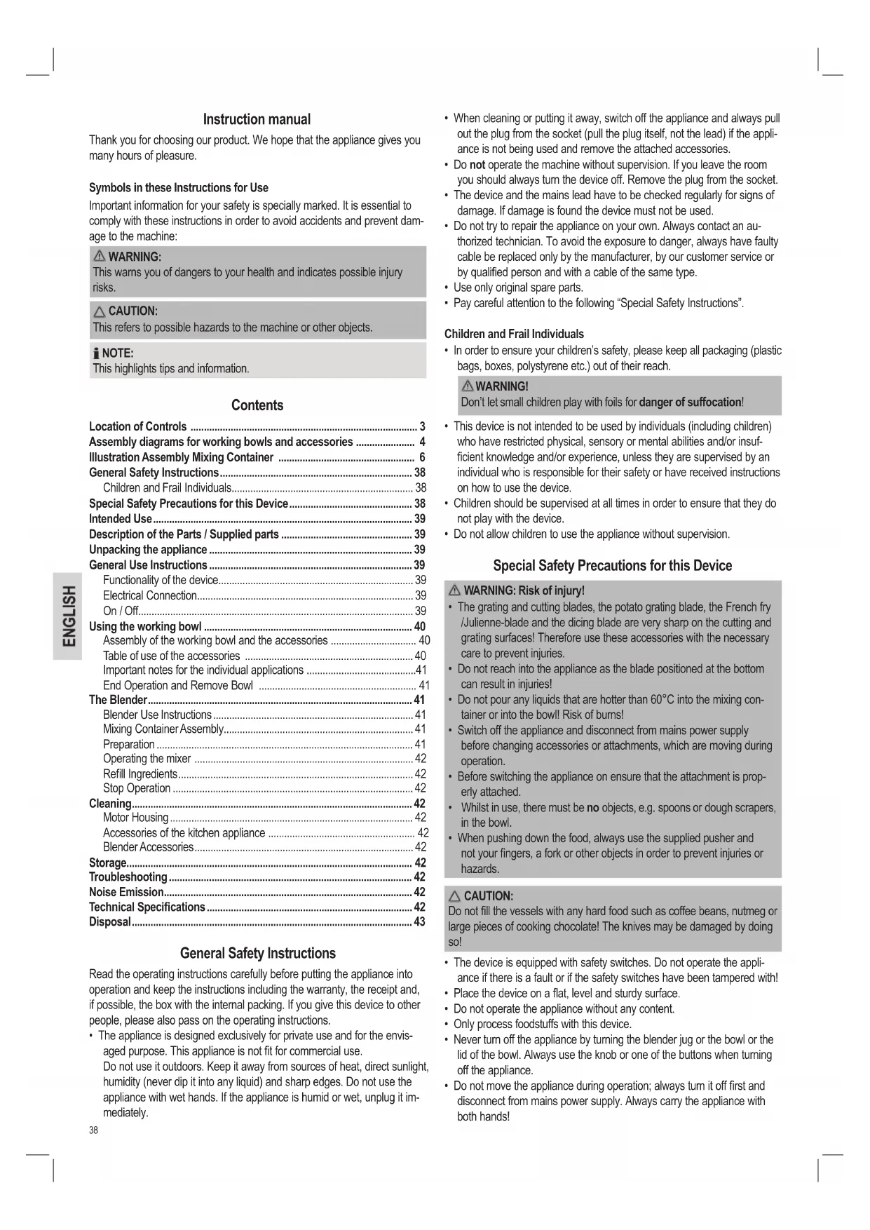 - blender to puree, whip or mix It is designed solely for these purposes and may only be used for them. It may only be used in the manner described in this instruction manual. The appliance may not be used for commercial purposes. Any other use is considered not as intended and may lead to damage to property or even personal injury. The manufacturer assumes no liability for damage resulting from use other than the intended purpose. Description of the Parts / Supplied parts Overview controls on page 3: 1 Two-part pusher 2 Lid of the working bowl with feed shaft 3 Kneading / Stirring tool 4 Working bowl 5 Guide pin 6 Drive shaft 7 Control panel 8 Motor housing 9 Whisk attachment with whisks 10 Dicing blade 11 French fry /Julienne blade 12 Potato grating blade 13 Fine grating / cutting blade 14 Coarse grating / cutting blade 15 Citrus press cone 16 Filter sieve 17 Blender jug cap 18 Blender jug lid with ller hole 19 Blender jug 20 Knife block Not shown: Dough scraper Unpacking the appliance