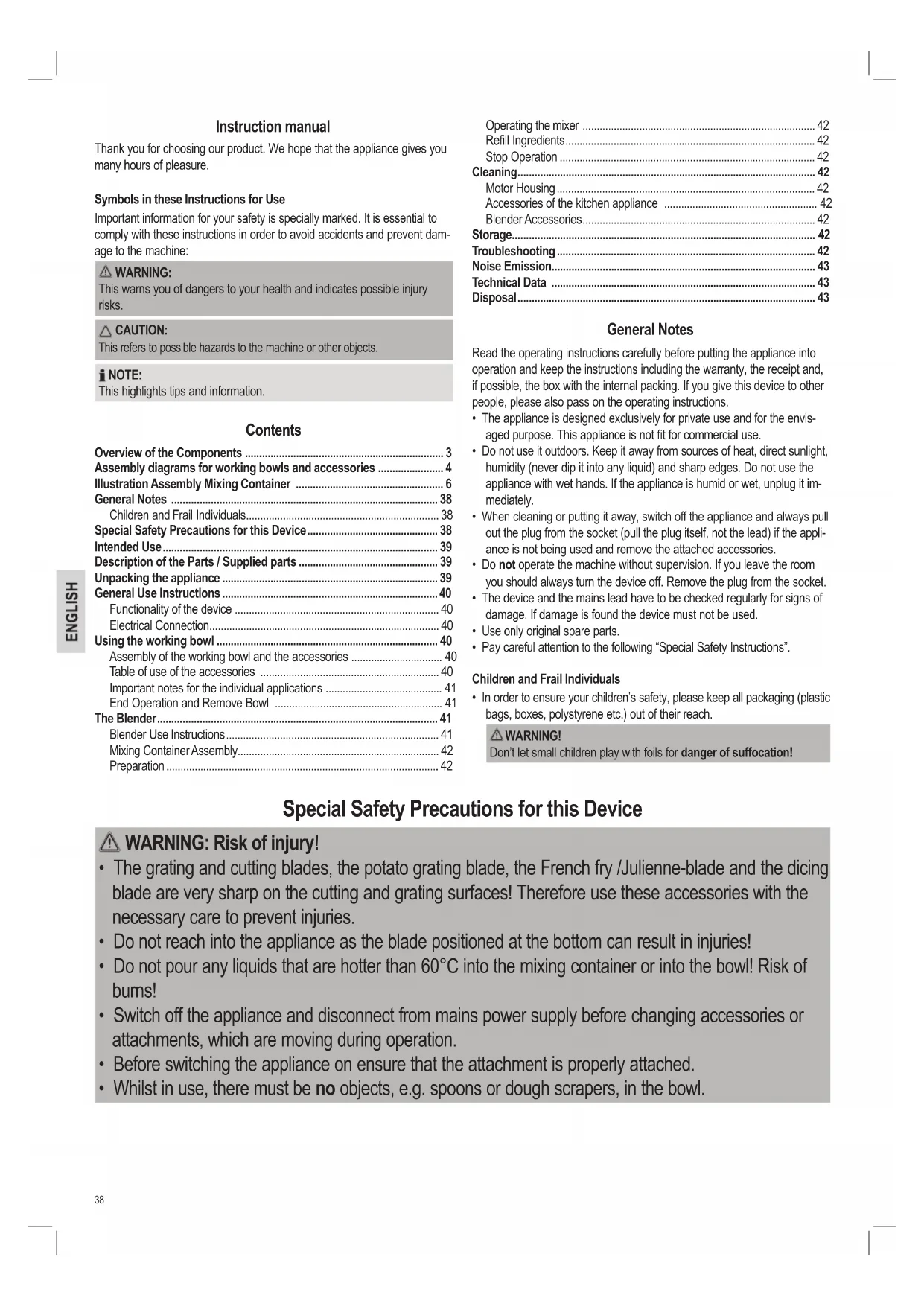 - Whilst in use, there must be no objects, e.g. spoons or dough scrapers, in the bowl.39 Intended Use This appliance is designed as a