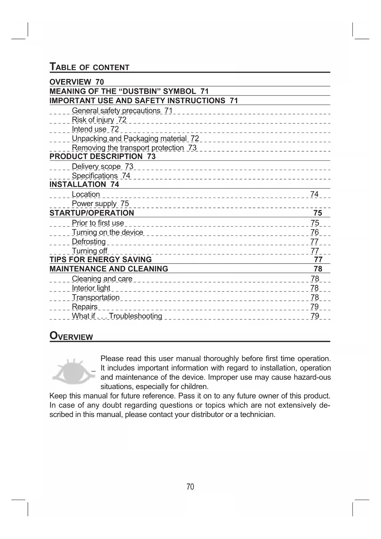 vervieW Please read this user manual thoroughly before rst time operation. It includes important information with regard to installation, operation and maintenance of the device. Improper use may cause hazard-ous situations, especially for children. Keep this manual for future reference. Pass it on to any future owner of this product. In case of any doubt regarding questions or topics which are not extensively de- scribed in this manual, please contact your distributor or a technician.71 MeaninG OF the “DUstBin” sYMBOl This product is marked in accordance with the European waste regulation