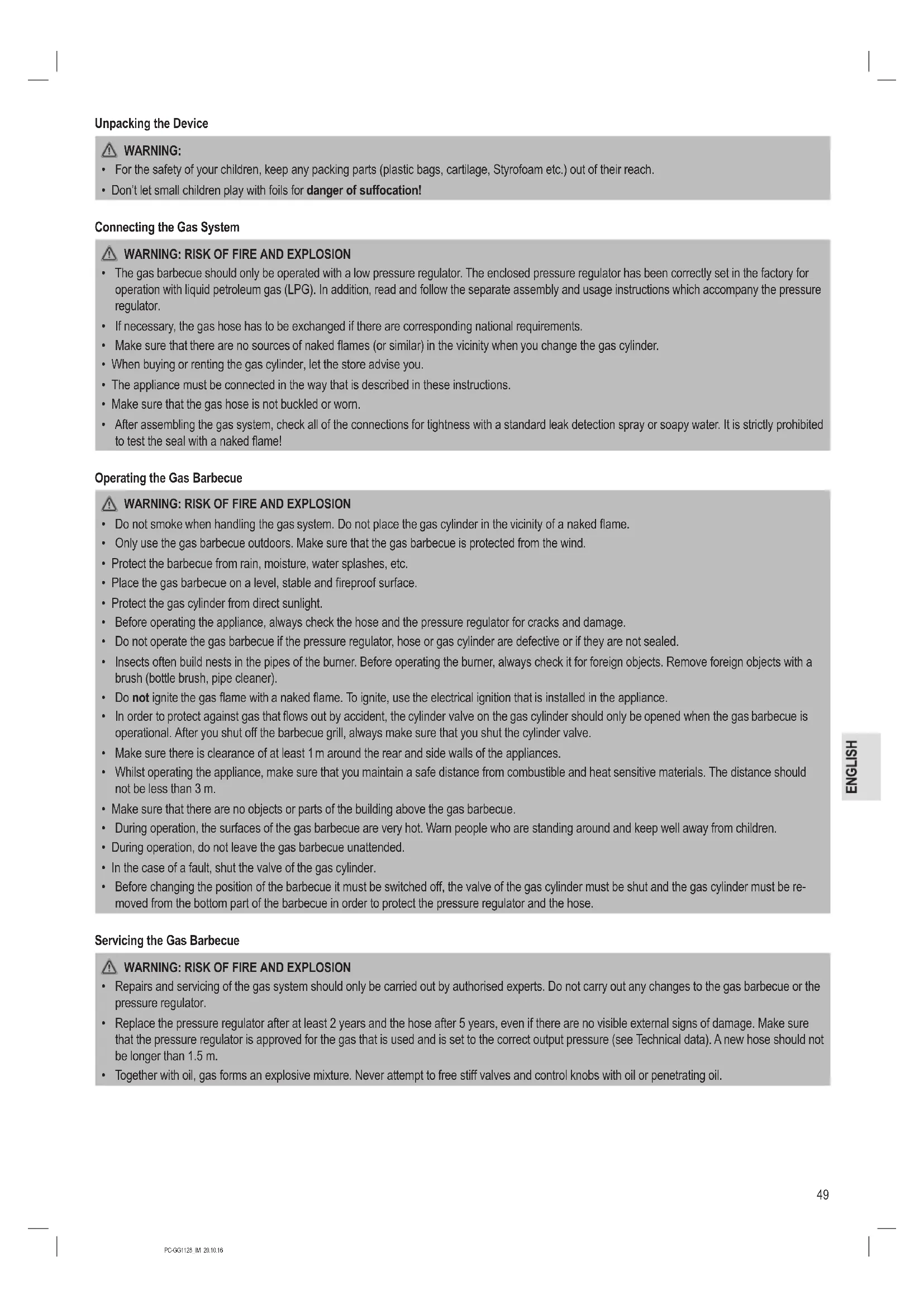 - PH2 screw driver Beforehand, remove the protective lm that is attached to the surfaces. When assembling, familiarise yourself with the list of parts and the illustrated assembly instructions:54 PC-GG1128_IM 20.10.1655 PC-GG1128_IM 20.10.1656 PC-GG1128_IM 20.10.1657 PC-GG1128_IM 20.10.1658 PC-GG1128_IM 20.10.16 Gas Connection General Information The barbecue can be operated with gas cylinders weighing between 5 kg and 11 kg. Low pressure butane, propane and LPG gas mixtures are approved. Your barbecue works best with propane gas and LPG mixtures. Butane can be used, on account of the power rating of the appliance, the gas cylinder may however freeze. As a result of this, the gas pressure drops and your barbecue does not provide full power. Use a regulator which is certied in accordance with DIN EN 16129. NOTE: For information concerning the correct regulator for gas cylinders, please consult your LPG dealer. Regulator and Hose These parts are supplied with the barbecue. You can obtain spare parts from your dealer or an approved LPG supplier. Only use hoses and regulators at the pressure stated above which are approved for LPG. Normally, the service life of a regulator is 2 years. It is recommended that the regulator is replaced within 2 years of the production date.
