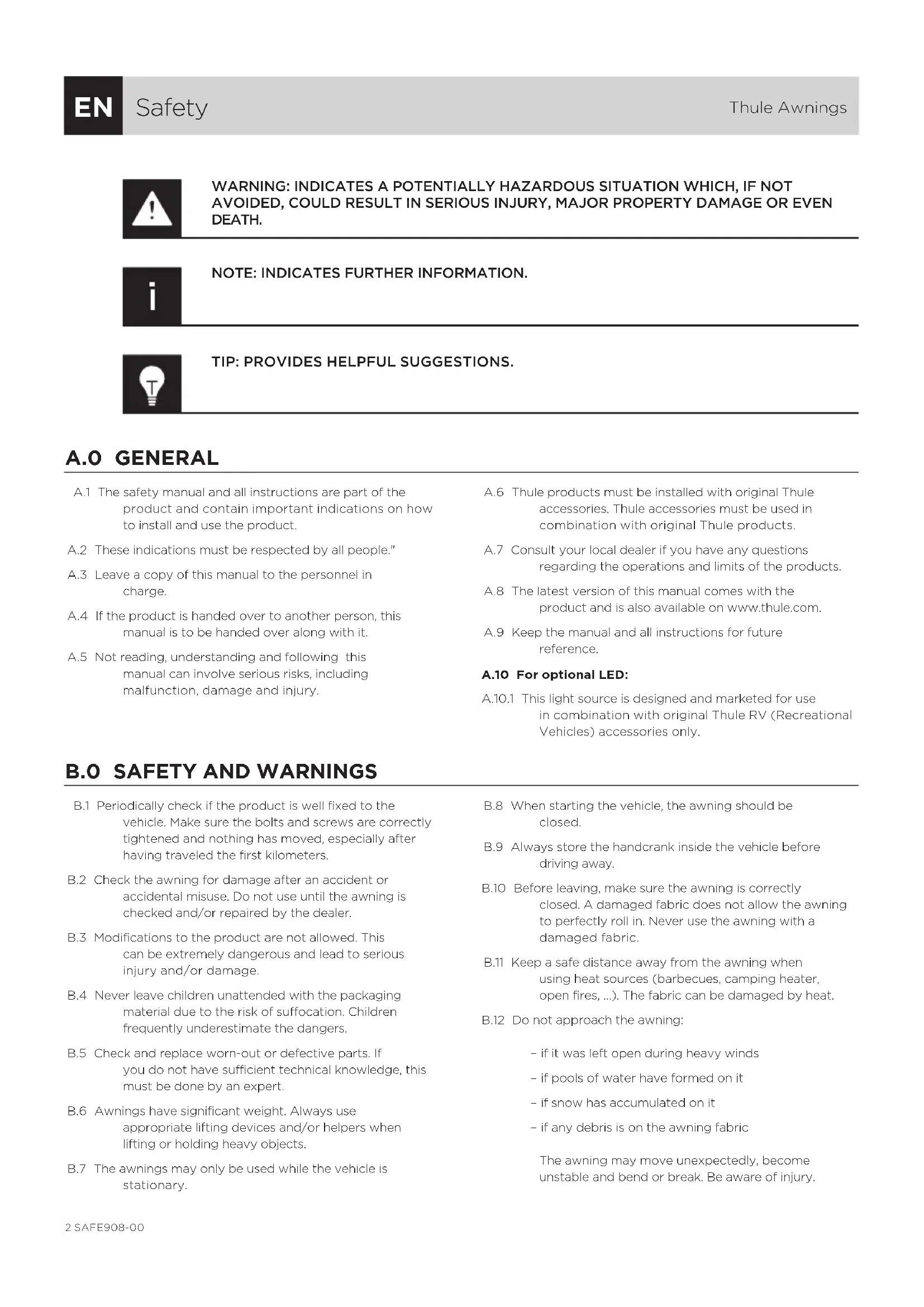 AVOIDED, COULD RESULT IN SERIOUS INJURY, MAJOR PROPERTY DAMAGE OR EVEN DEATH. NOTE: INDICATES FURTHER INFORMATION. TIP: PROVIDES HELPFUL SUGGESTIONS. A.0 GENERAL A.1 The safety manual and all instructions are part of the product and contain important indications on how to install and use the product. A.2 These indications must be respected by all people."A.3 Leave a copy of this manual to the personnel in charge.A.4 If the product is handed over to another person, this manual is to be handed over along with it.A.5 Not reading, understanding and following this manual can involve serious risks, including malfunction, damage and injury.A.6 Thule products must be installed with original Thule accessories. Thule accessories must be used in combination with original Thule products.A.7 Consult your local dealer if you have any questions regarding the operations and limits of the products.A.8 The latest version of this manual comes with the product and is also available on www.thule.com.A.9 Keep the manual and all instructions for future reference.A.10 For optional LED:A.10.1 This light source is designed and marketed for use in combination with original Thule RV (Recreational Vehicles) accessories only.