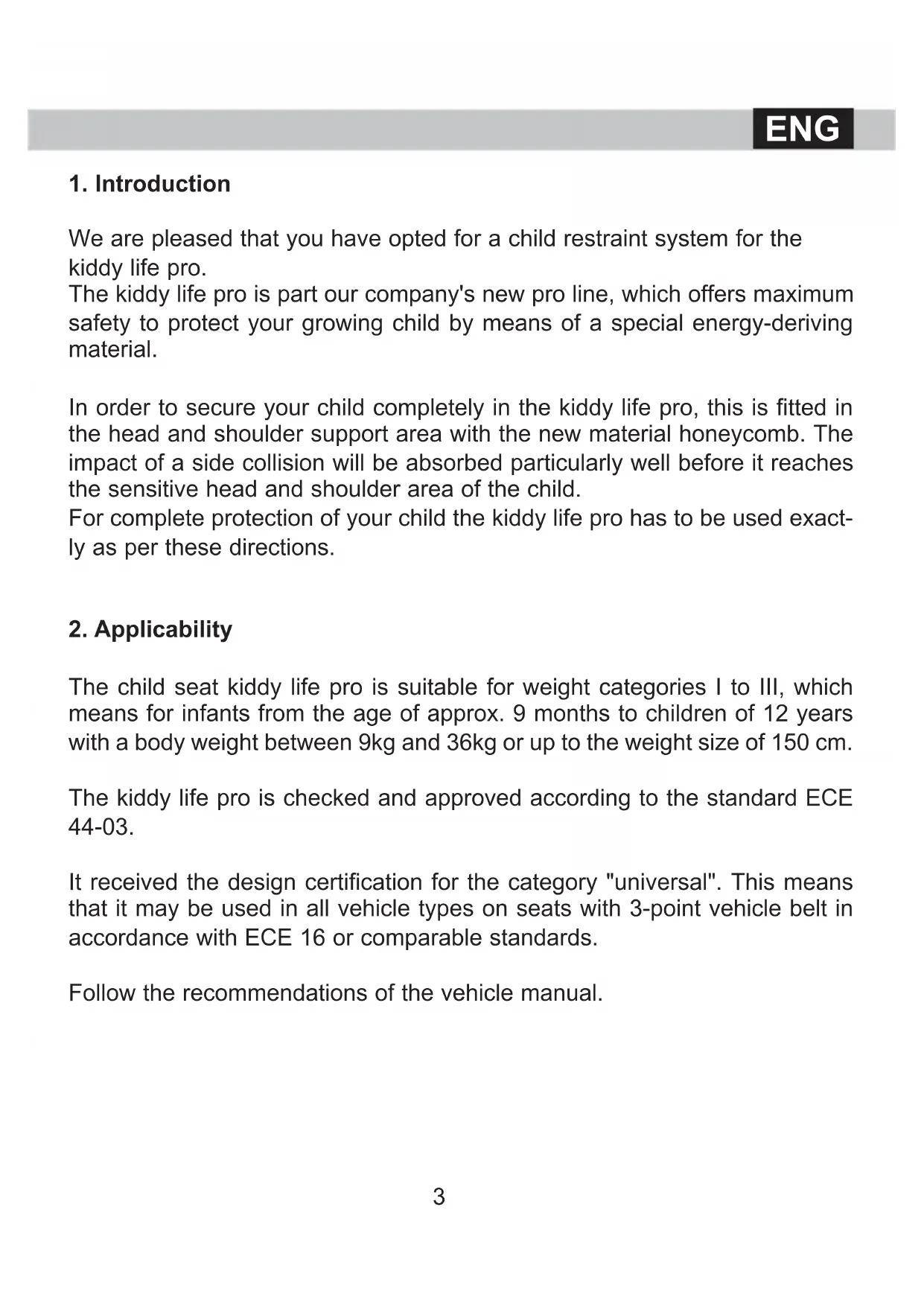 We are pleased that you have opted for a child restraint system for the kiddy life pro. The kiddy life pro is part our company's new pro line, which offers maximum safety to protect your growing child by means of a special energy-deriving material. In order to secure your child completely in the kiddy life pro, this is fitted in the head and shoulder support area with the new material honeycomb. The impact of a side collision will be absorbed particularly well before it reaches the sensitive head and shoulder area of the child. For complete protection of your child the kiddy life pro has to be used exact- ly as per these directions.