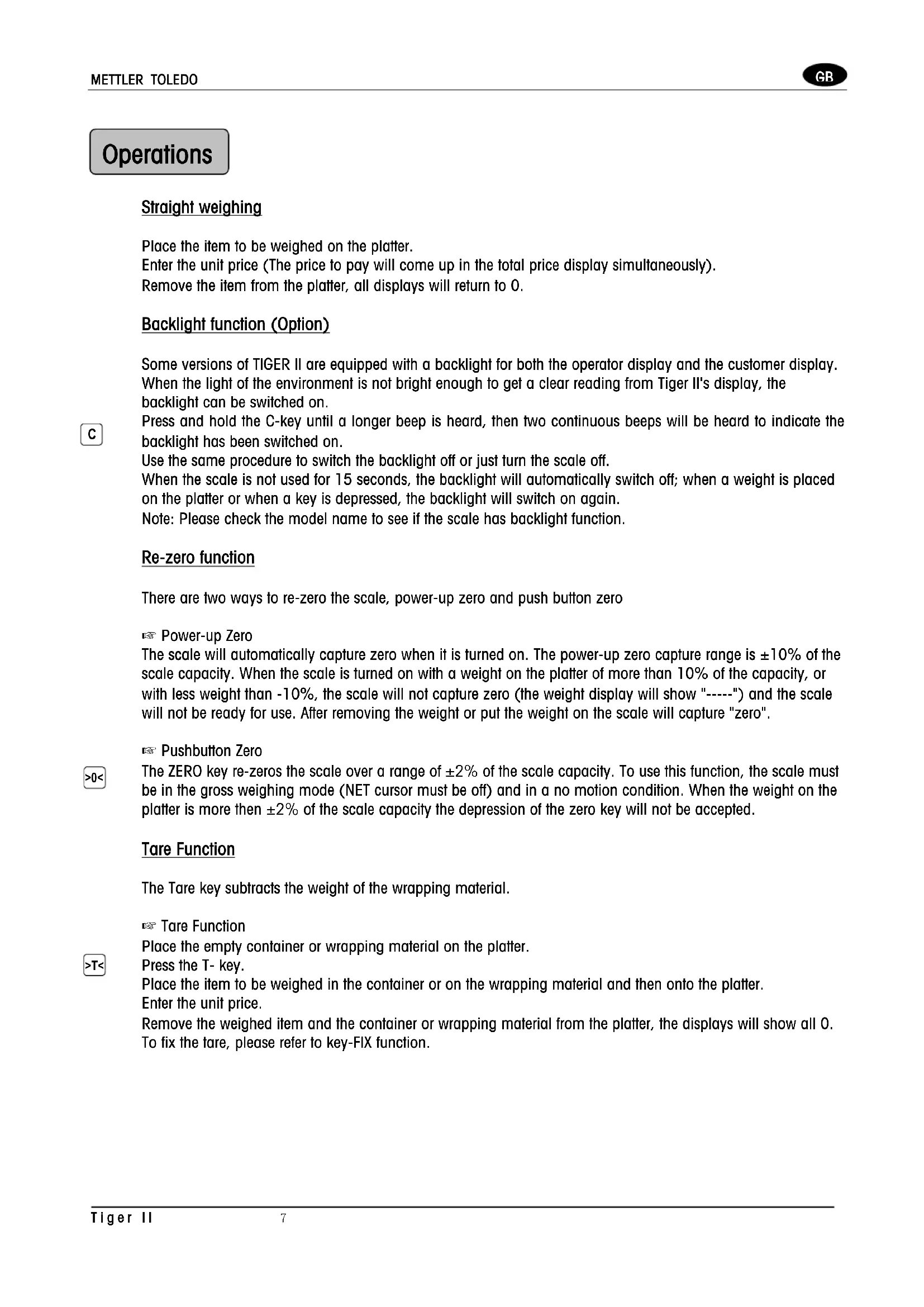 Straight weighing Place the item to be weighed on the platter. Enter the unit price (The price to pay will come up in the total price display simultaneously). Remove the item from the platter, all displays will return to 0. Backlight function (Option) Some versions of TIGER II are equipped with a backlight for both the operator display and the customer display. When the light of the environment is not bright enough to get a clear reading from Tiger II's display, the backlight can be switched on. Press and hold the C-key until a longer beep is heard, then two continuous beeps will be heard to indicate the backlight has been switched on. Use the same procedure to switch the backlight off or just turn the scale off. When the scale is not used for 15 seconds, the backlight will automatically switch off; when a weight is placed on the platter or when a key is depressed, the backlight will switch on again. Note: Please check the model name to see if the scale has backlight function. Re-zero function There are two ways to re-zero the scale, power-up zero and push button zero ☞ Power-up Zero The scale will automatically capture zero when it is turned on. The power-up zero capture range is ±10% of the scale capacity. When the scale is turned on with a weight on the platter of more than 10% of the capacity, or with less weight than -10%, the scale will not capture zero (the weight display will show "-----") and the scale will not be ready for use. After removing the weight or put the weight on the scale will capture "zero".