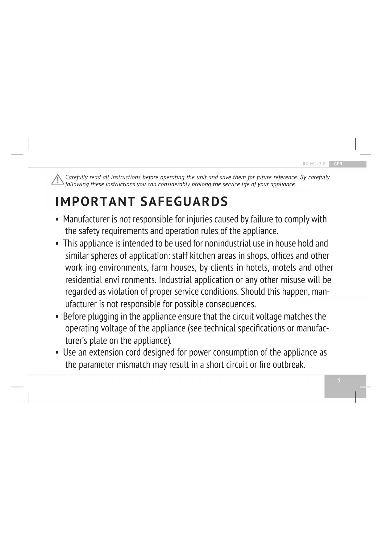 GBR FRA DEU NLD ITA ESP PRT DNK NOR SWE FIN LTU LVA EST ROU HUN BGR HRV SRB SVK CZE POL RUS GRE TUR ARE3 RK-M142-E GBR Carefully read all instructions before operating the unit and save them for future reference. By carefully following these instructions you can considerably prolong the service life of your appliance. IMPORTANT SAFEGUARDS