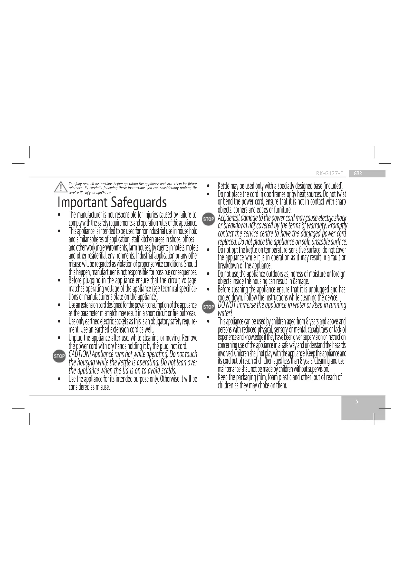 GBR RK-G127-E Carefully read all instructions before operating the appliance and save them for future reference. By carefully following these instructions you can considerably prolong the service life of your appliance. Important Safeguards