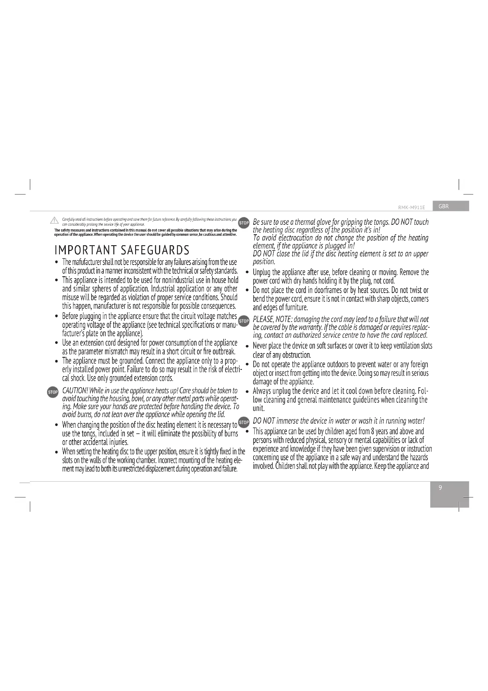 GBR Carefully read all instructions before operating and save them for future reference. By carefully following these instructions you can considerably prolong the service life of your appliance. The safety measures and instructions contained in this manual do not cover all possible situations that may arise during the operation of the appliance. When operating the device the user should be guided by common sense, be cautious and attentive. IMPORTANT SAFEGUARDS