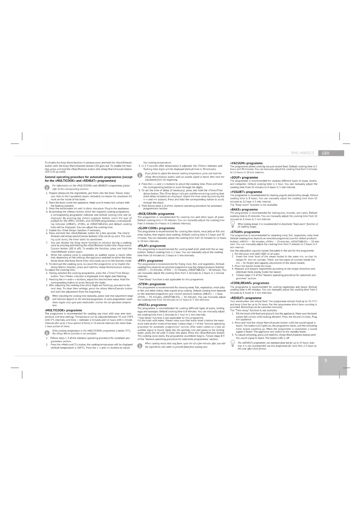 Press the «–» and «+» buttons to increase or reduce the cooking time. Press and hold the corresponding button to scroll through the digits. To get information concerning time adjustment for the «MULTICOOK» pro- gramme please refer to the corresponding section below. The Time Delay function is not applicable for the «FRY» and «PASTA» pro- grammes. When adjusting Time Delay, please note that the «STEAM» programme count- down begins only upon reaching the operating temperature (after water comes to a boil). Avoid using the «Time Delay» function for dairy and other perishable food. Keep Warm function The function automatically activates at the end of a cooking cycle (not appli- cable for the «YOGURT» programme) and keeps food warm at 70-75°С for up to 24 hours. If Keep Warm is activated, the «Keep Warm/Cancel» button LED is lit up solid, and the timer begins to count the operating time. To disable the function, press and hold the «Keep Warm/Cancel» button.GBR RMC-M800S-E