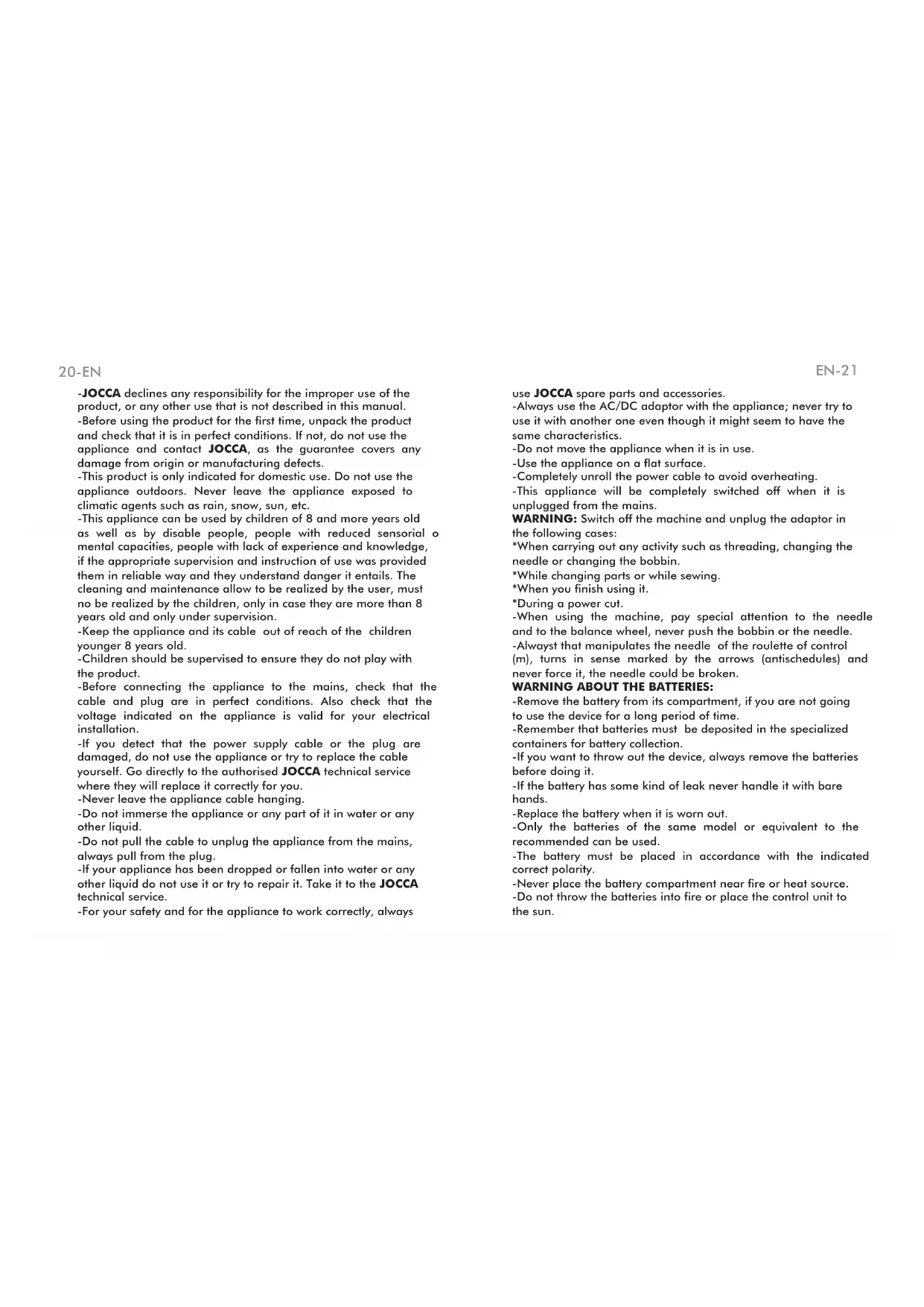 PURCHASE ACKNOWLEDGEMENT JOCCA thanks you for the trust placed in the purchase of our product and we are certain that you will always be satisfied with any of our products. For better service of all your questions and needs, JOCCA customer service is at your disposal to solve any query: atencionalcliente@jocca.es PRODUCT DESCRIPTION a- Thread guide 1 b- Needle adjustment screw c- Thread guide 2 ACCESSORIES INCLUDED: d- Needle - Pedal e- Presser foot - Power adaptor f- Lid - Threader g- Lower bobbin compartment - 4 Bobbins h- Pedal socket - Extra needle i- Adaptor socket j- Speed button k- On/Off button l- Long spindle for winding. m-Needle control balance wheel n- Bobbin o- Thread guide 3 p- Foldable spindle q- Thread tension disc r- Thread stretching bar s- Thread guide 4 t- Presser foot lifting lever SAFETY WARNINGS -These instructions are very important. Please read this instructions manual carefully before using the appliance and keep it at hand to refer to it at any time. EN-19 18-PT-JOCCA declines any responsibility for the improper use of the product, or any other use that is not described in this manual. -Before using the product for the first time, unpack the product and check that it is in perfect conditions. If not, do not use the appliance and contact JOCCA, as the guarantee covers any damage from origin or manufacturing defects. -This product is only indicated for domestic use. Do not use the appliance outdoors. Never leave the appliance exposed to climatic agents such as rain, snow, sun, etc. -This appliance can be used by children of 8 and more years old as well as by disable people, people with reduced sensorial o mental capacities, people with lack of experience and knowledge, if the appropriate supervision and instruction of use was provided them in reliable way and they understand danger it entails. The cleaning and maintenance allow to be realized by the user, must no be realized by the children, only in case they are more than 8 years old and only under supervision. -Keep the appliance and its cable out of reach of the children younger 8 years old. -Children should be supervised to ensure they do not play with the product. -Before connecting the appliance to the mains, check that the cable and plug are in perfect conditions. Also check that the voltage indicated on the appliance is valid for your electrical installation. -If you detect that the power supply cable or the plug are damaged, do not use the appliance or try to replace the cable yourself. Go directly to the authorised JOCCA technical service where they will replace it correctly for you. -Never leave the appliance cable hanging. -Do not immerse the appliance or any part of it in water or any other liquid. -Do not pull the cable to unplug the appliance from the mains, always pull from the plug. -If your appliance has been dropped or fallen into water or any other liquid do not use it or try to repair it. Take it to the JOCCA technical service. -For your safety and for the appliance to work correctly, always use JOCCA spare parts and accessories. -Always use the AC/DC adaptor with the appliance; never try to use it with another one even though it might seem to have the same characteristics. -Do not move the appliance when it is in use. -Use the appliance on a flat surface. -Completely unroll the power cable to avoid overheating. -This appliance will be completely switched off when it is unplugged from the mains.
