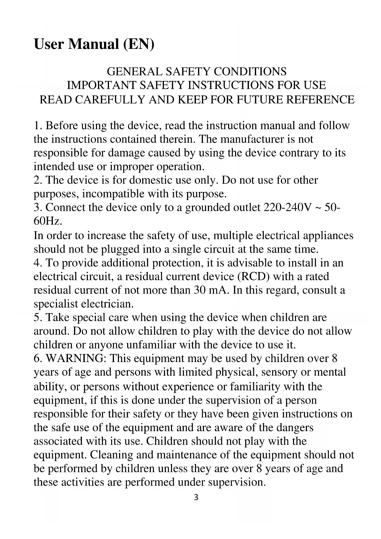 2. The device is for domestic use only. Do not use for other
