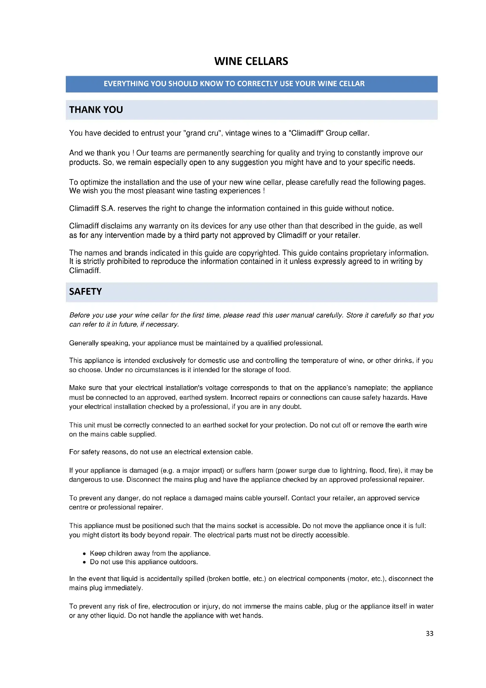 Les pièces détachées nécessaires à la réparation de cet appareil seront disponibles pendant 7 ans.33 WINE CELLARS EVERYTHING YOU SHOULD KNOW TO CORRECTLY USE YOUR WINE CELLAR THANK YOU You have decided to entrust your "grand cru", vintage wines to a "Climadiff" Group cellar. And we thank you ! Our teams are permanently searching for quality and trying to constantly improve our products. So, we remain especially open to any suggestion you might have and to your specific needs. To optimize the installation and the use of your new wine cellar, please carefully read the following pages. We wish you the most pleasant wine tasting experiences ! Climadiff S.A. reserves the right to change the information contained in this guide without notice. Climadiff disclaims any warranty on its devices for any use other than that described in the guide, as well as for any intervention made by a third party not approved by Climadiff or your retailer. The names and brands indicated in this guide are copyrighted. This guide contains proprietary information. It is strictly prohibited to reproduce the information contained in it unless expressly agreed to in writing by Climadiff. SAFETY Before you use your wine cellar for the first time, please read this user manual carefully. Store it carefully so that you can refer to it in future, if necessary. Generally speaking, your appliance must be maintained by a qualified professional. This appliance is intended exclusively for domestic use and controlling the temperature of wine, or other drinks, if you so choose. Under no circumstances is it intended for the storage of food. Make sure that your electrical installation's voltage corresponds to that on the appliance’s nameplate; the appliance must be connected to an approved, earthed system. Incorrect repairs or connections can cause safety hazards. Have your electrical installation checked by a professional, if you are in any doubt. This unit must be correctly connected to an earthed socket for your protection. Do not cut off or remove the earth wire on the mains cable supplied. For safety reasons, do not use an electrical extension cable. If your appliance is damaged (e.g. a major impact) or suffers harm (power surge due to lightning, flood, fire), it may be dangerous to use. Disconnect the mains plug and have the appliance checked by an approved professional repairer. To prevent any danger, do not replace a damaged mains cable yourself. Contact your retailer, an approved service centre or professional repairer. This appliance must be positioned such that the mains socket is accessible. Do not move the appliance once it is full: you might distort its body beyond repair. The electrical parts must not be directly accessible. Keep children away from the appliance. Do not use this appliance outdoors. In the event that liquid is accidentally spilled (broken bottle, etc.) on electrical components (motor, etc.), disconnect the mains plug immediately. To prevent any risk of fire, electrocution or injury, do not immerse the mains cable, plug or the appliance itself in water or any other liquid. Do not handle the appliance with wet hands.34