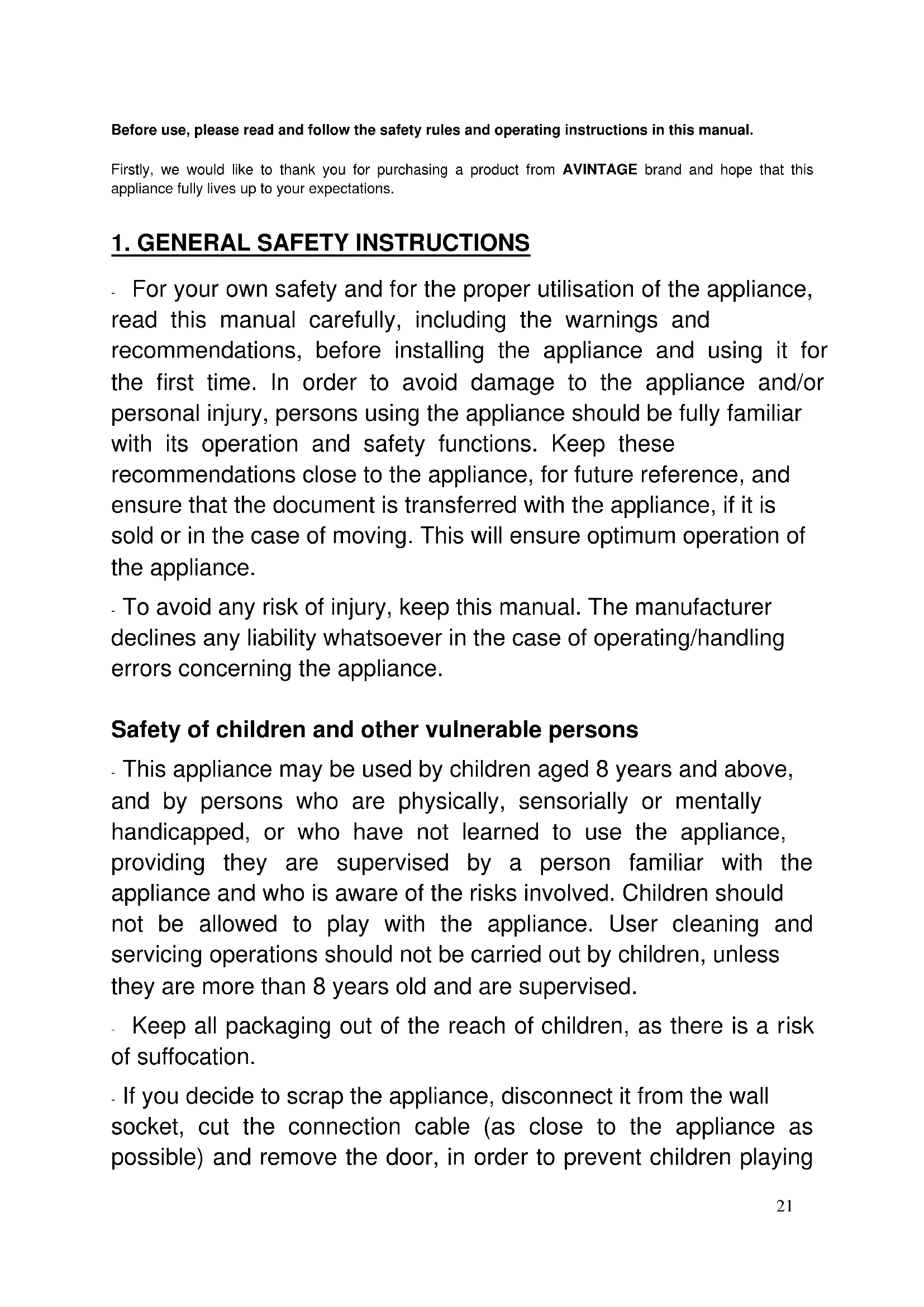 Cet appareil est destiné uniquement au stockage du vin.21 Before use, please read and follow the safety rules and operating instructions in this manual. Firstly, we would like to thank you for purchasing a product from AVINTAGE brand and hope that this appliance fully lives up to your expectations.