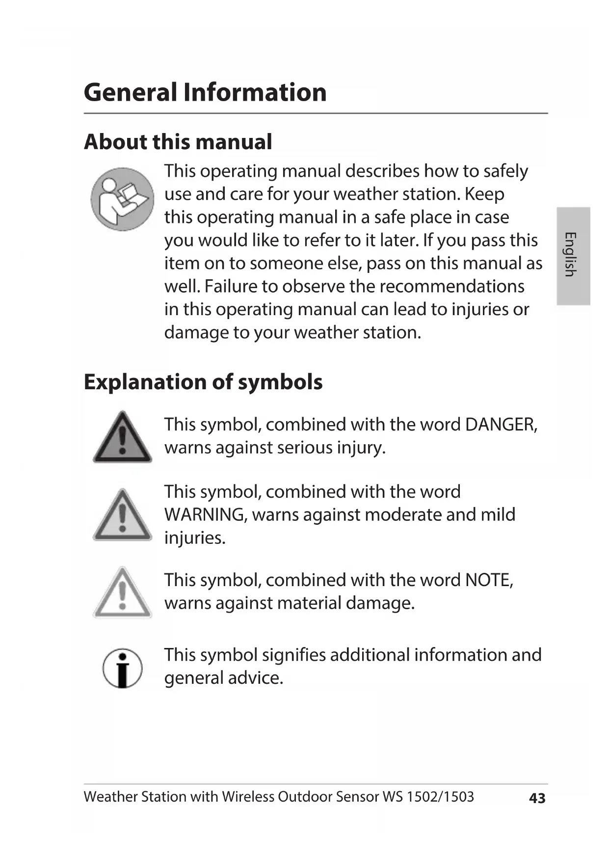 This operating manual describes how to safely use and care for your weather station. Keep this operating manual in a safe place in case you would like to refer to it later. If you pass this item on to someone else, pass on this manual as well. Failure to observe the recommendations in this operating manual can lead to injuries or damage to your weather station.