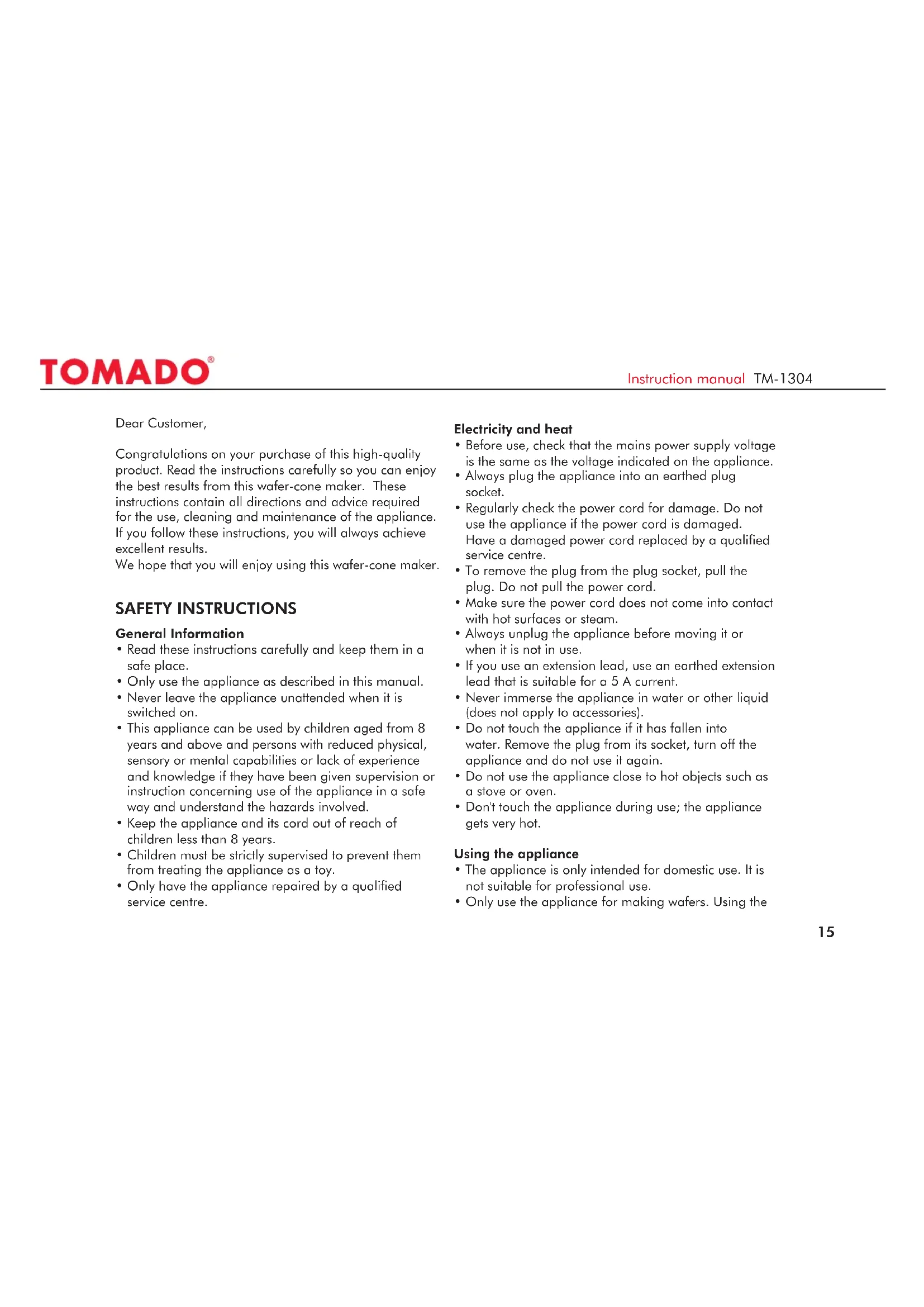 - Always clean the appliance after use so that any food remains do not become encrusted. Clean the appliance as follows: Clean the cooking plates with a moist cloth or a soft Instruction manual TM-130419 dishwashing brush. Dry the cooking plates thoroughly with a tea towel. Use only a damp cloth to clean the appliance body. Dry it with a cloth. STORAGE Store the appliance in a dry place. TECHNICAL INFORMATION TM-1304 Power: 1000 W Voltage: 230 V / 50 Hz Min/max temp.: room temperature / 230 °C Net weight: 2.1 kg RECIPE Wafer batter 200 g all-purpose flour – 150 g white sugar – 150 g butter – 2 eggs – vanilla essence or cinnamon to taste – 1 pinch of salt. Melt butter very slowly and then add the remaining ingredients – mix everything thoroughly. Add a few tablespoons of lukewarm water if necessary to make the batter workable. Instruction manual TM-1304the appliance in breach of the locally applicable safety regulations and technical standards (for instance an inferior AC outlet). The warranty under no circumstances grants the right for any compensation.