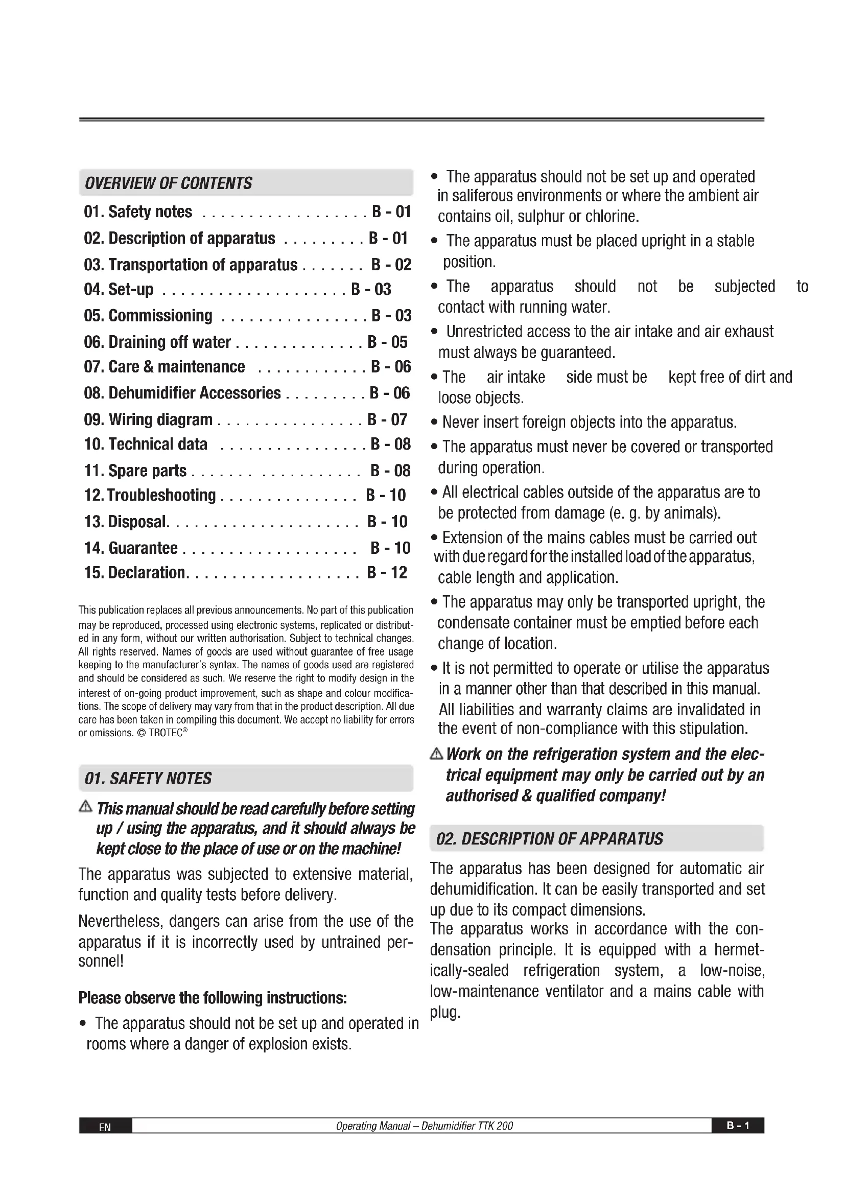 The apparatus has been designed for automatic air dehumidification. It can be easily transported and set up due to its compact dimensions. The apparatus works in accordance with the con- densation principle. It is equipped with a hermet- ically-sealed refrigeration system, a low-noise, low-maintenance ventilator and a mains cable with plug.Operating Manual – Dehumidifier TTK 200 B - 2