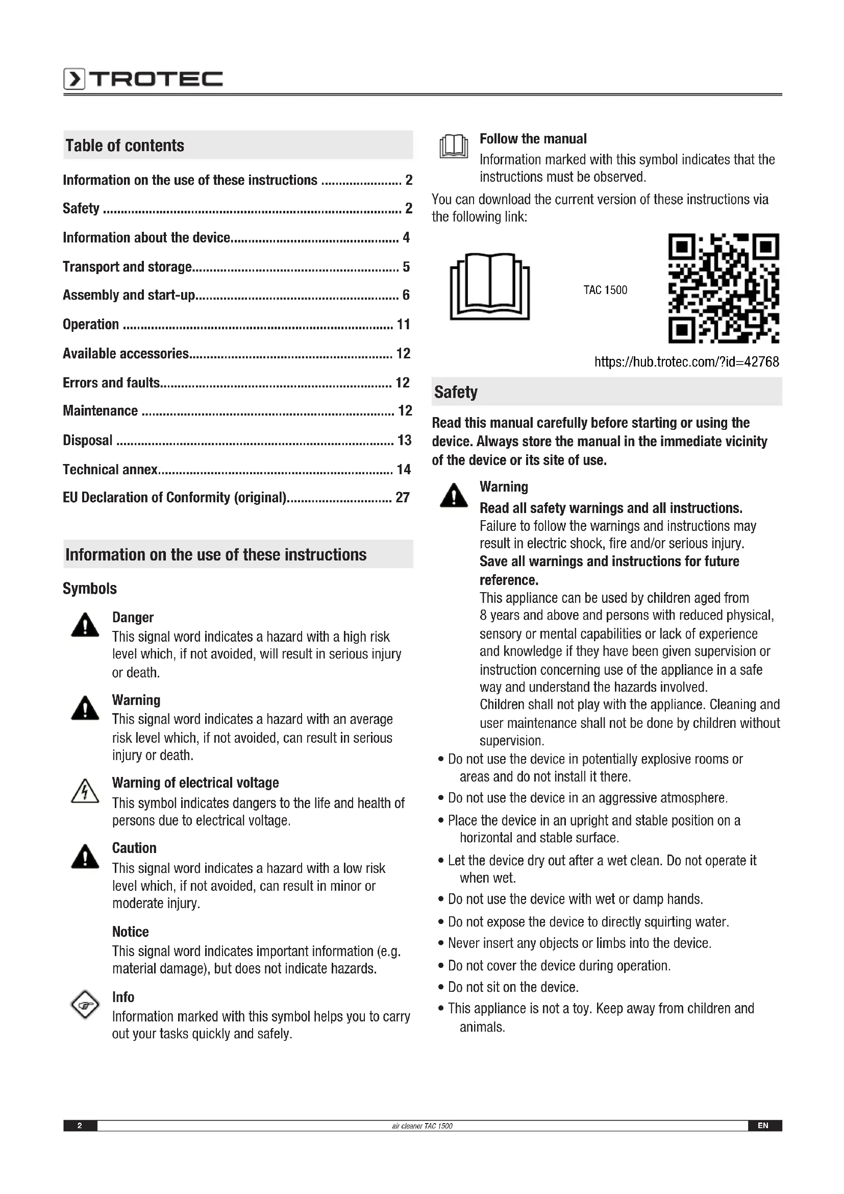 - EU Declaration of Conformity (original) Information on the use of these instructions Symbols Danger This signal word indicates a hazard with a high risk level which, if not avoided, will result in serious injury or death. Warning This signal word indicates a hazard with an average risk level which, if not avoided, can result in serious injury or death. Warning of electrical voltage This symbol indicates dangers to the life and health of persons due to electrical voltage. Caution This signal word indicates a hazard with a low risk level which, if not avoided, can result in minor or moderate injury. Notice This signal word indicates important information (e.g. material damage), but does not indicate hazards. Info Information marked with this symbol helps you to carry out your tasks quickly and safely. Follow the manual Information marked with this symbol indicates that the instructions must be observed. You can download the current version of these instructions via the following link: TAC 1500 https://hub.trotec.com/?id=42768 Safety Read this manual carefully before starting or using the device. Always store the manual in the immediate vicinity of the device or its site of use. Warning Read all safety warnings and all instructions. Failure to follow the warnings and instructions may result in electric shock, fire and/or serious injury. Save all warnings and instructions for future reference. This appliance can be used by children aged from 8years and above and persons with reduced physical, sensory or mental capabilities or lack of experience and knowledge if they have been given supervision or instruction concerning use of the appliance in a safe way and understand the hazards involved. Children shall not play with the appliance. Cleaning and user maintenance shall not be done by children without supervision. p. 27