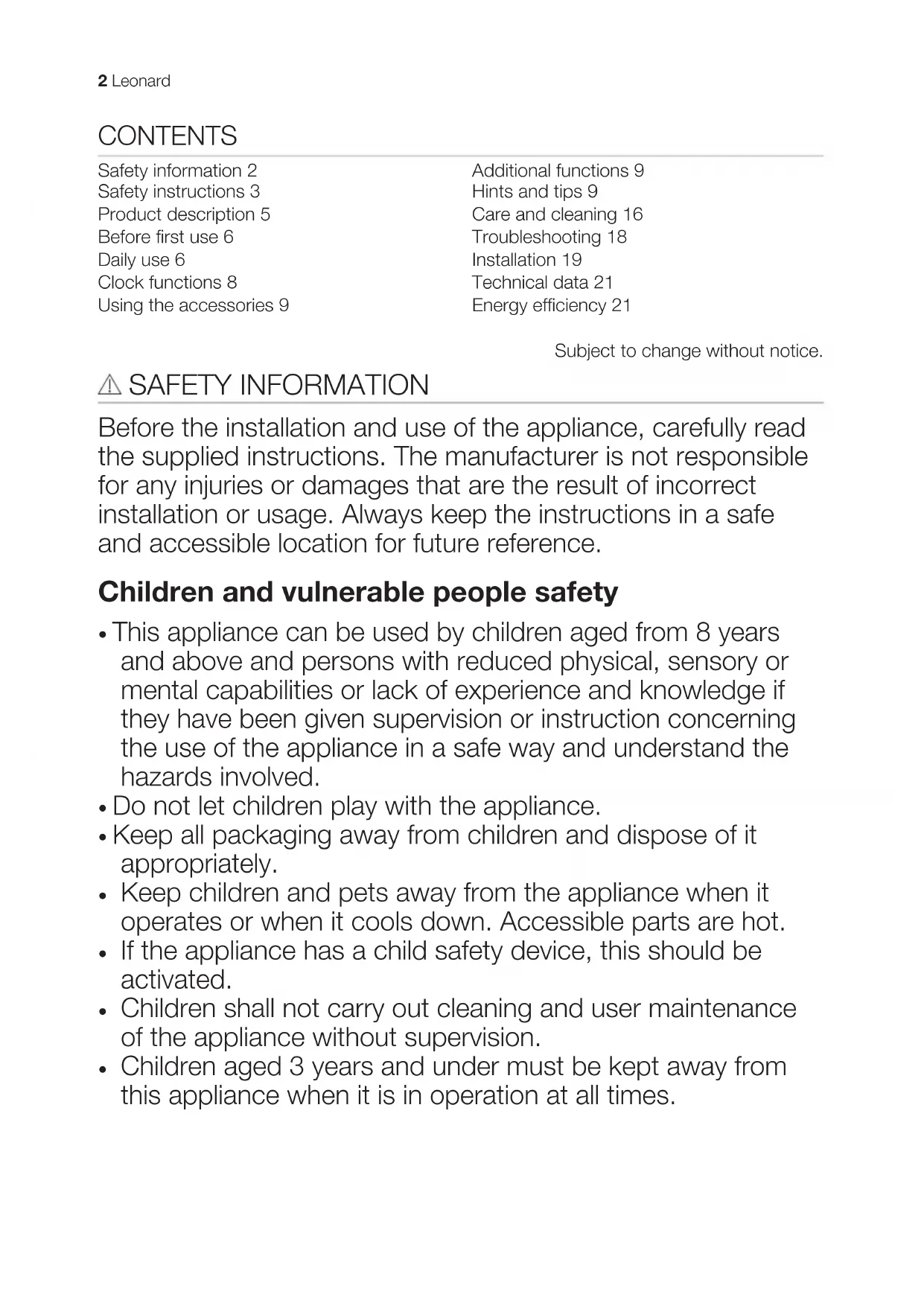 - This appliance can be used by children aged from 8 years and above and persons with reduced physical, sensory or mental capabilities or lack of experience and knowledge if they have been given supervision or instruction concerning the use of the appliance in a safe way and understand the hazards involved.