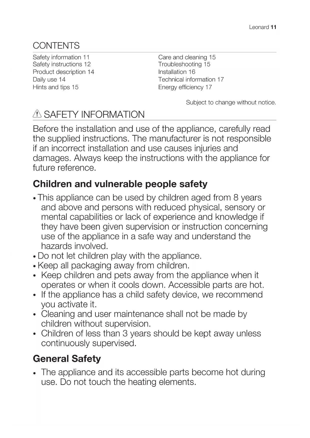 The appliance and its accessible parts become hot during use. Do not touch the heating elements. Leonard 11• Do not operate the appliance by means of an external timer or separate remote-control system.