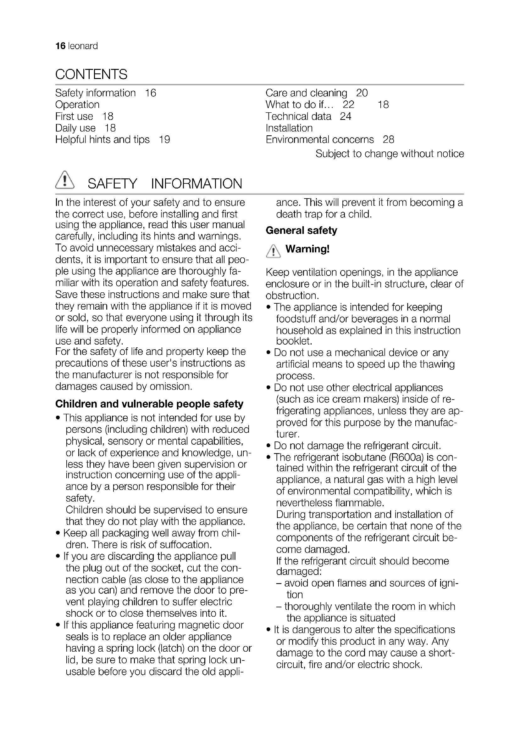 - The door opens and closes correctly. ENVIRONMENTAL CONCERNS The symbol on the product or on its packaging indicates that this product may not be treated as household waste. Instead it should be taken to the appropriate collection point for the recycling of electrical and electronic equipment. By ensuring this product is disposed of correctly, you will help prevent potential negative consequences for the environment and human health, which could otherwise be caused by inappropriate waste handling of this product. For more detailed information about recycling of this product, please contact your local council, your household 28 leonardwaste disposal service or the shop where you purchased the product. leonard 29SOMMAIRE Consignes de sécurité 30 Fonctionnement 32 Première utilisation 33 Utilisation quotidienne 33 Conseils utiles 34 Entretien et nettoyage 36 En cas d'anomalie de fonctionnement 37 Caractéristiques techniques 39 Installation 39 En matière de sauvegarde de l'environnement 44 Sous réserve de modifications