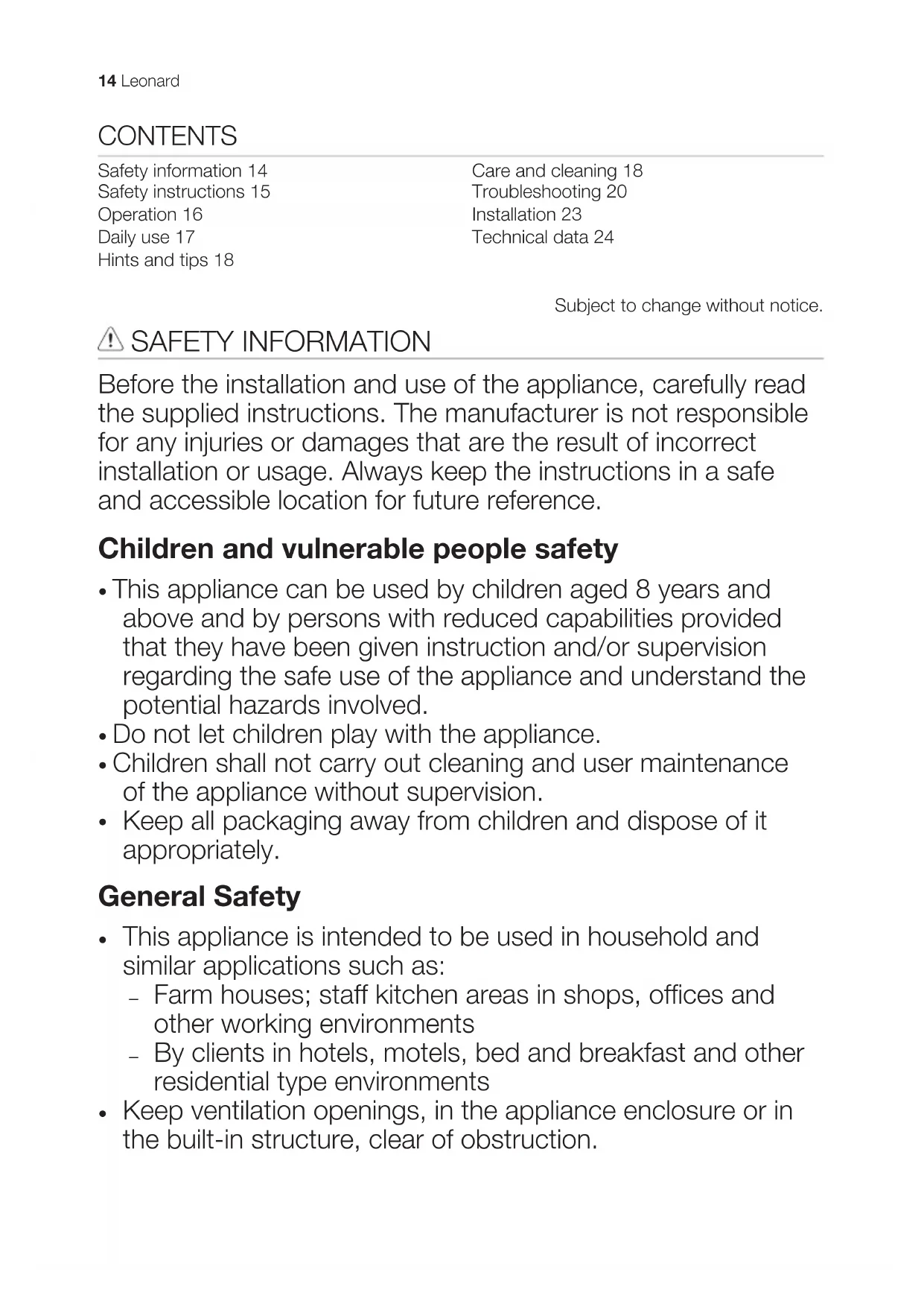 Keep ventilation openings, in the appliance enclosure or in the built-in structure, clear of obstruction. 14 Leonard• Do not use mechanical devices or other means to accelerate the defrosting process, other than those recommended by the manufacturer.