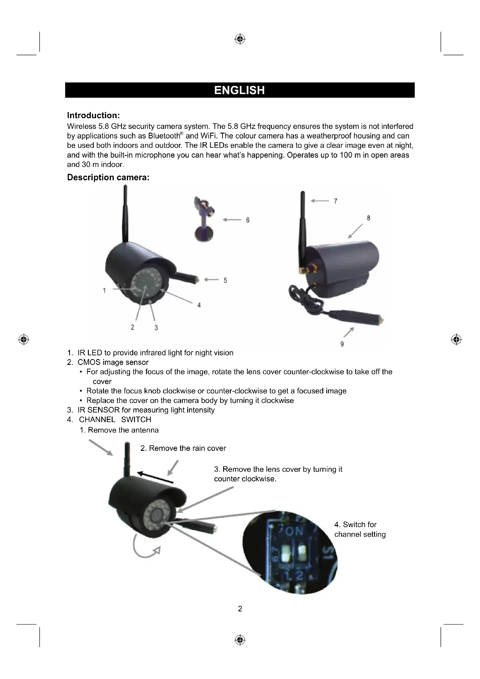 and WiFi. The colour camera has a weatherproof housing and can be used both indoors and outdoor. The IR LEDs enable the camera to give a clear image even at night, and with the built-in microphone you can hear what’s happening. Operates up to 100 m in open areas and 30 m indoor. Description camera: