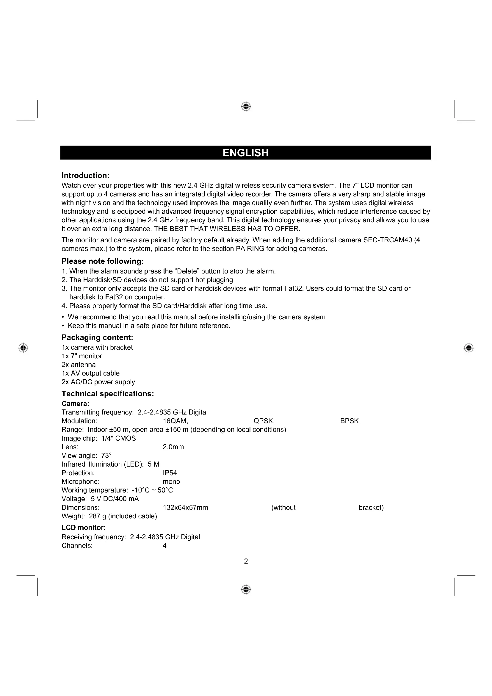 - Keep this manual in a safe place for future reference. Packaging content: 1x camera with bracket 1x 7" monitor 2x antenna 1x AV output cable 2x AC/DC power supply Technical specifications: Camera: Transmitting frequency: 2.4-2.4835 GHz Digital Modulation: 16QAM, QPSK, BPSK Range: Indoor ±50 m, open area ±150 m (depending on local conditions) Image chip: 1/4" CMOS Lens: 2.0mm View angle: 73° Infrared illumination (LED): 5 M Protection: IP54 Microphone: mono Working temperature: -10°C ~ 50°C Voltage: 5 V DC/400 mA Dimensions: 132x64x57mm (without bracket) Weight: 287 g (included cable) LCD monitor: Receiving frequency: 2.4-2.4835 GHz Digital Channels: 43 Size: 7" TFT/LCD Max. resolution: 800 RGB (H)* 480 (V) pixels SD card: up to 32 GB (not included) Video frame rate: 25 fps (max.) 10 fps (4x cameras) Recording frame rate: 25 fps per channel Video resolution: CIF/VGA Video format: AVI USB: 2.0 Menu language: English, German, French and Dutch Video output level: 1 Vp-p/75 Ohm Audio output level: 2Vrms@600ohm mono Audio/video output connector: 2.5mm jack (2.5mm cable to 3 x RCA included) Range: Indoor ±50 m, open area ±150 m (depending on local conditions) Operating temperature: 0°C to +40°C Voltage: 5 V DC/650 mA Dimensions: 214x157x26 mm Weight: 488 g Safety precautions: