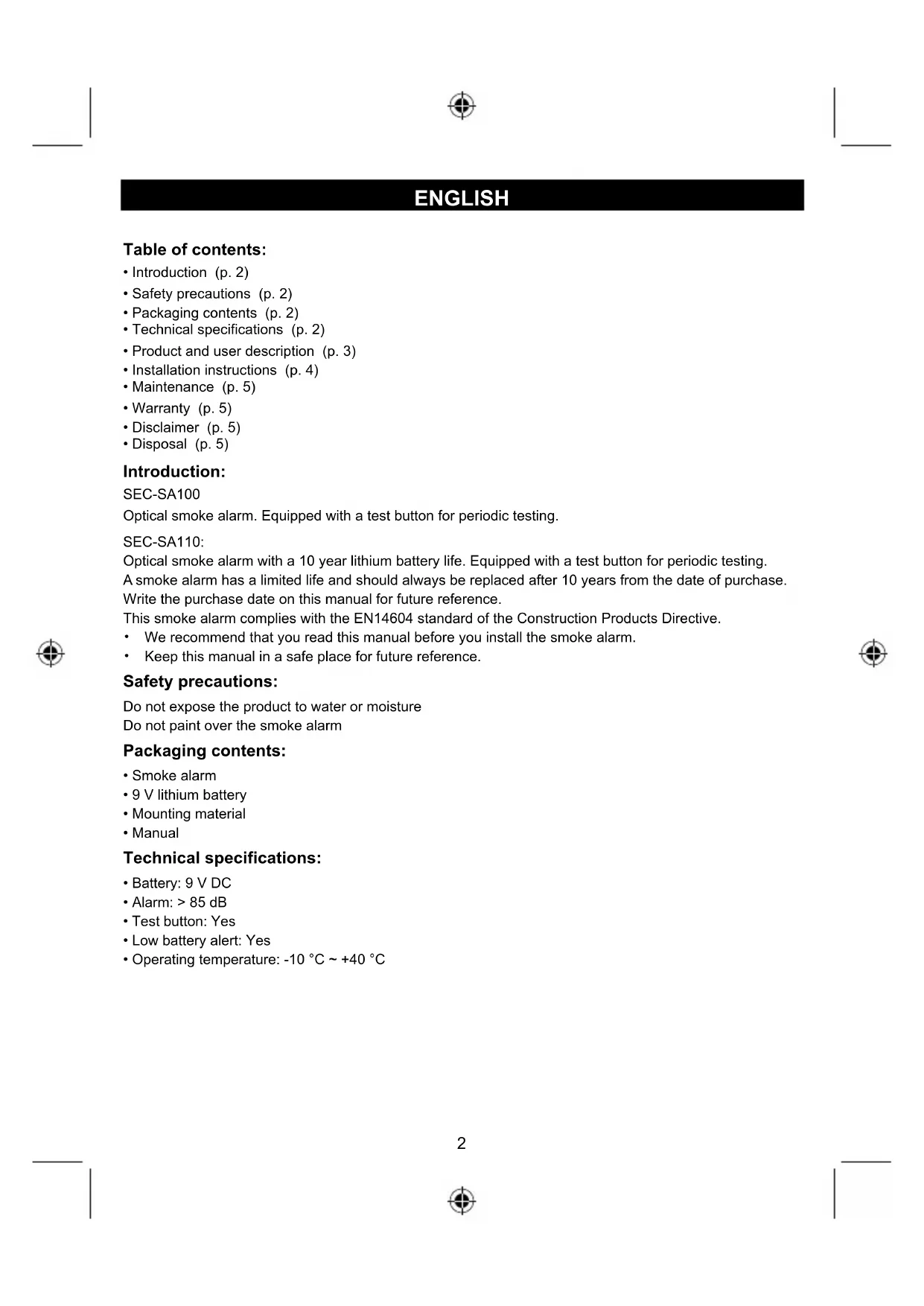 - Disposal (p. 5) Introduction: SEC-SA100 Optical smoke alarm. Equipped with a test button for periodic testing. SEC-SA110: Optical smoke alarm with a 10 year lithium battery life. Equipped with a test button for periodic testing. A smoke alarm has a limited life and should always be replaced after 10 years from the date of purchase. Write the purchase date on this manual for future reference. This smoke alarm complies with the EN14604 standard of the Construction Products Directive.
