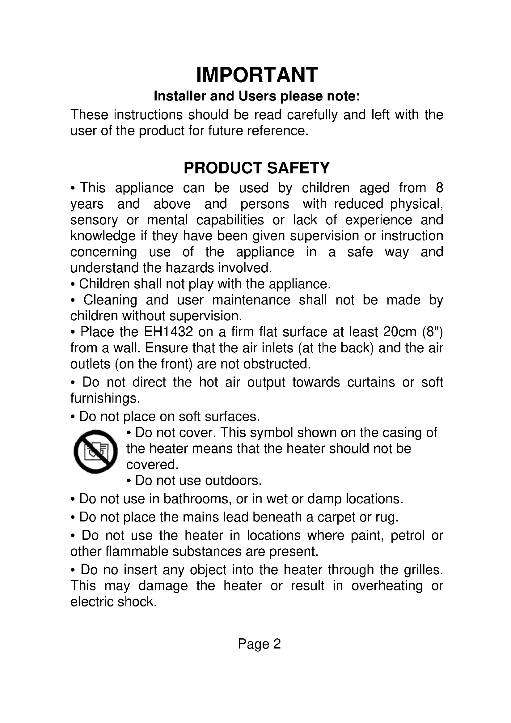 - Do not cover. This symbol shown on the casing of the heater means that the heater should not be covered.