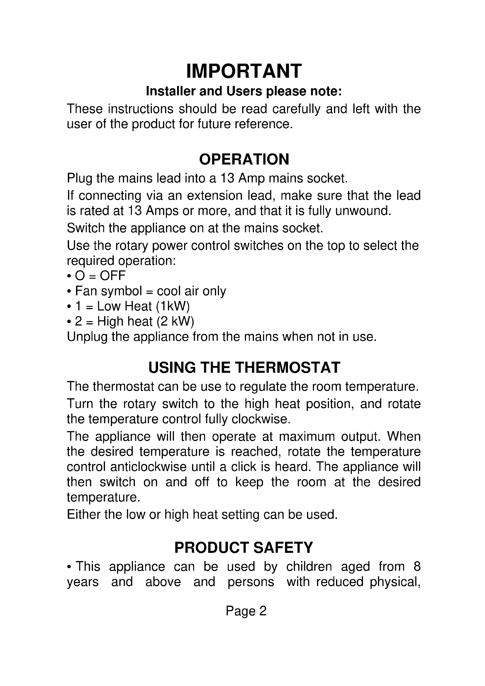 - Coupure de Sécurité en cas de Surchauffe Page 1IMPORTANT Installer and Users please note: These instructions should be read carefully and left with the user of the product for future reference. OPERATION Plug the mains lead into a 13 Amp mains socket. If connecting via an extension lead, make sure that the lead is rated at 13 Amps or more, and that it is fully unwound. Switch the appliance on at the mains socket. Use the rotary power control switches on the top to select the required operation: