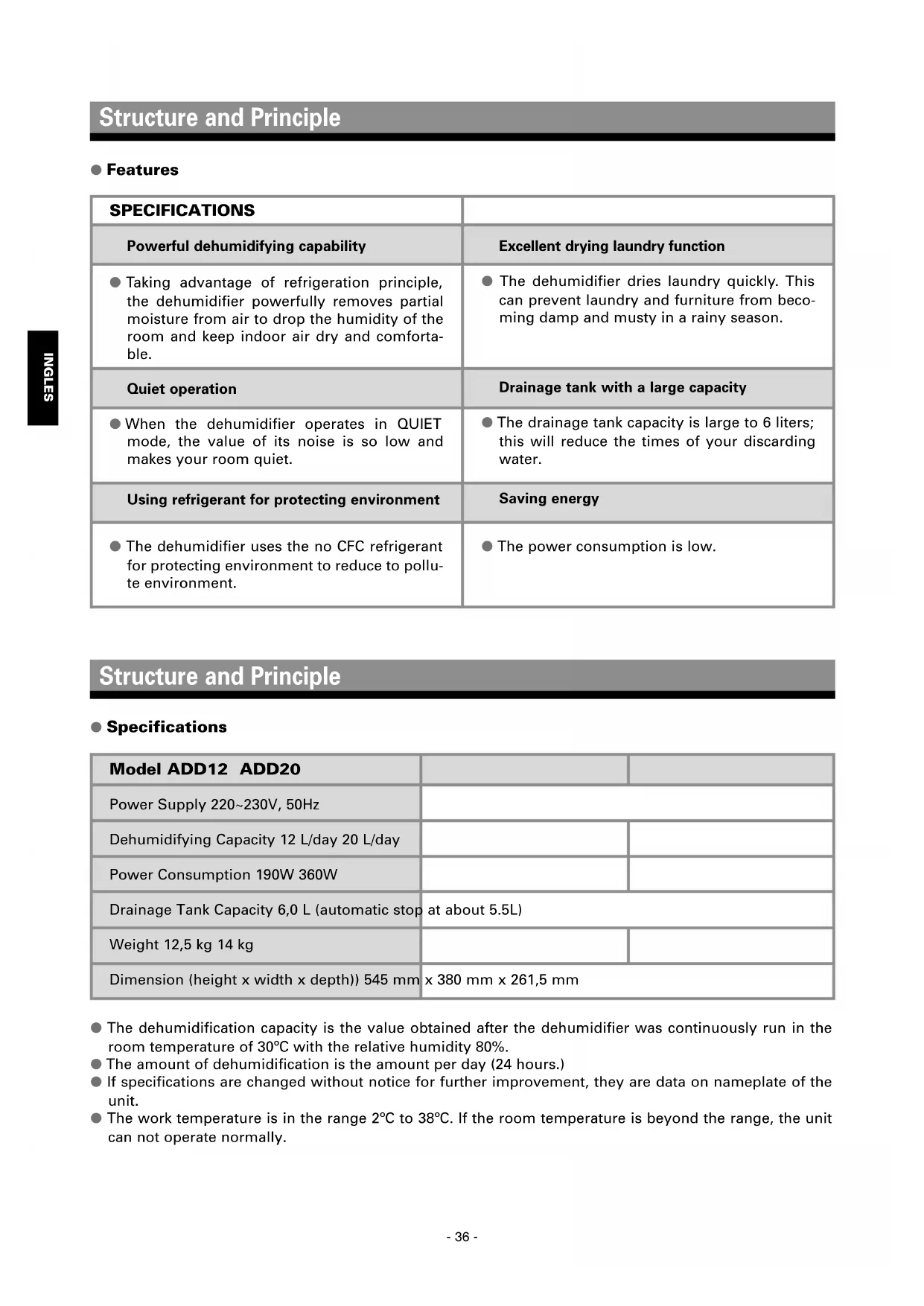 ● The dehumidification capacity is the value obtained after the dehumidifier was continuously run in the room temperature of 30ºC with the relative humidity 80%. ● The amount of dehumidification is the amount per day (24 hours.) ● If specifications are changed without notice for further improvement, they are data on nameplate of the unit. ● The work temperature is in the range 2ºC to 38ºC. If the room temperature is beyond the range, the unit can not operate normally. Structure and Principle Powerful dehumidifying capability ● Taking advantage of refrigeration principle, the dehumidifier powerfully removes partial moisture from air to drop the humidity of the room and keep indoor air dry and comforta- ble. Quiet operation ● When the dehumidifier operates in QUIET mode, the value of its noise is so low and makes your room quiet. Using refrigerant for protecting environment ● The dehumidifier uses the no CFC refrigerant for protecting environment to reduce to pollu- te environment. Excellent drying laundry function ● The dehumidifier dries laundry quickly. This can prevent laundry and furniture from beco- ming damp and musty in a rainy season. Drainage tank with a large capacity ● The drainage tank capacity is large to 6 liters; this will reduce the times of your discarding water. Saving energy ● The power consumption is low. SPECIFICATIONS ● Features Structure and Principle Power Supply 220~230V, 50Hz Dehumidifying Capacity 12 L/day 20 L/day Power Consumption 190W 360W Drainage Tank Capacity 6,0 L (automatic stop at about 5.5L) Weight 12,5 kg 14 kg Dimension (height x width x depth)) 545 mm x 380 mm x 261,5 mm Model ADD12 ADD20 ● Specifications- 37 - INGLES Structure and Principle If you pour cold water into a cup, the air around the cup is cooled, and drops of water form on the surface of the cup. The dehumidifier takes advantage of this phenomenon to remove moisture. ➀ It draws in room air, cools it with a coo- ling unit, and changes the humidity to drops of water. ➁ The drops of water fall into a drainage tank. ➂ The dehumidified air is re-heated by a heating unit and discharged. Steps ➀, ➁ and ➂ are repeated to remove humidity from the room. ● After the air passes through the re-heating unit, its temperature will rise a little, so that the tempe- rature of the room will rise appreciably. This is normal phenomenon. ● How dehumidifying works Structure and Principle ● Structure of dehumidifier Louver Operation panel Guard Water level gauge Drainage tank Handle Discharge port Float Cooling unit Moist air Compressor Dried air Drainage tank Re-heating unitINGLES