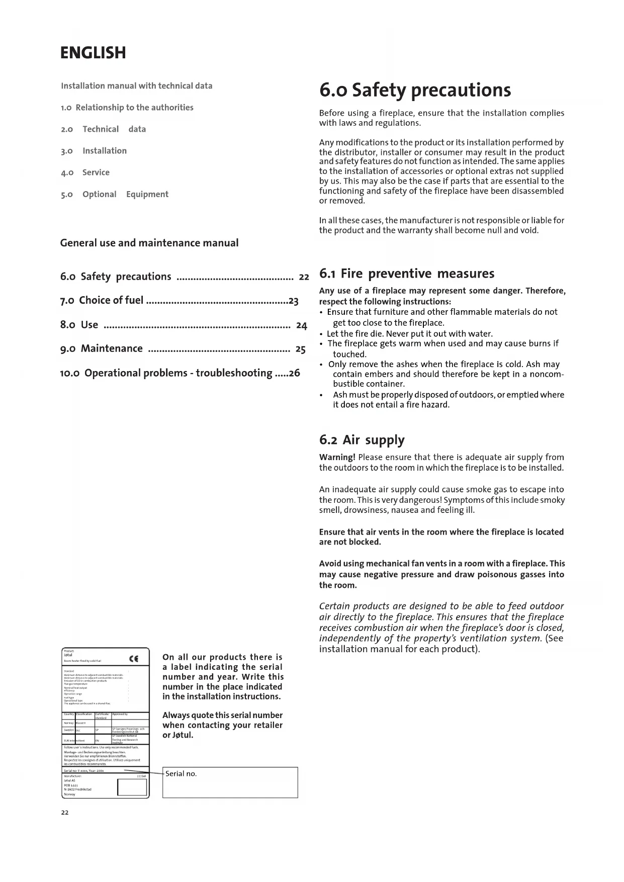 Serial no. On all our products there is a label indicating the serial number and year. Write this number in the place indicated in the installation instructions. Always quote this serial number when contacting your retailer or Jøtul.