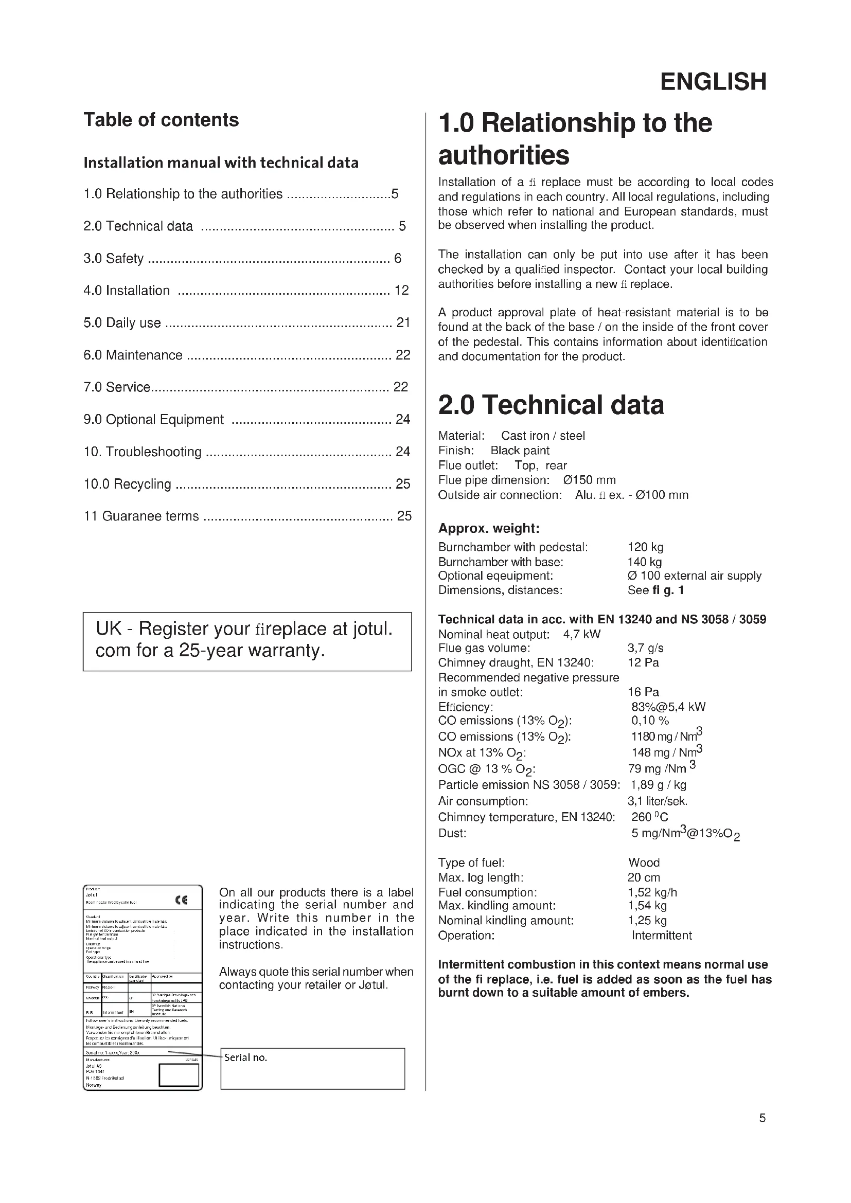 Serial no. On all our products there is a label indicating the serial number and year. Write this number in the place indicated in the installation instructions. Always quote this serial number when contacting your retailer or Jøtul.6