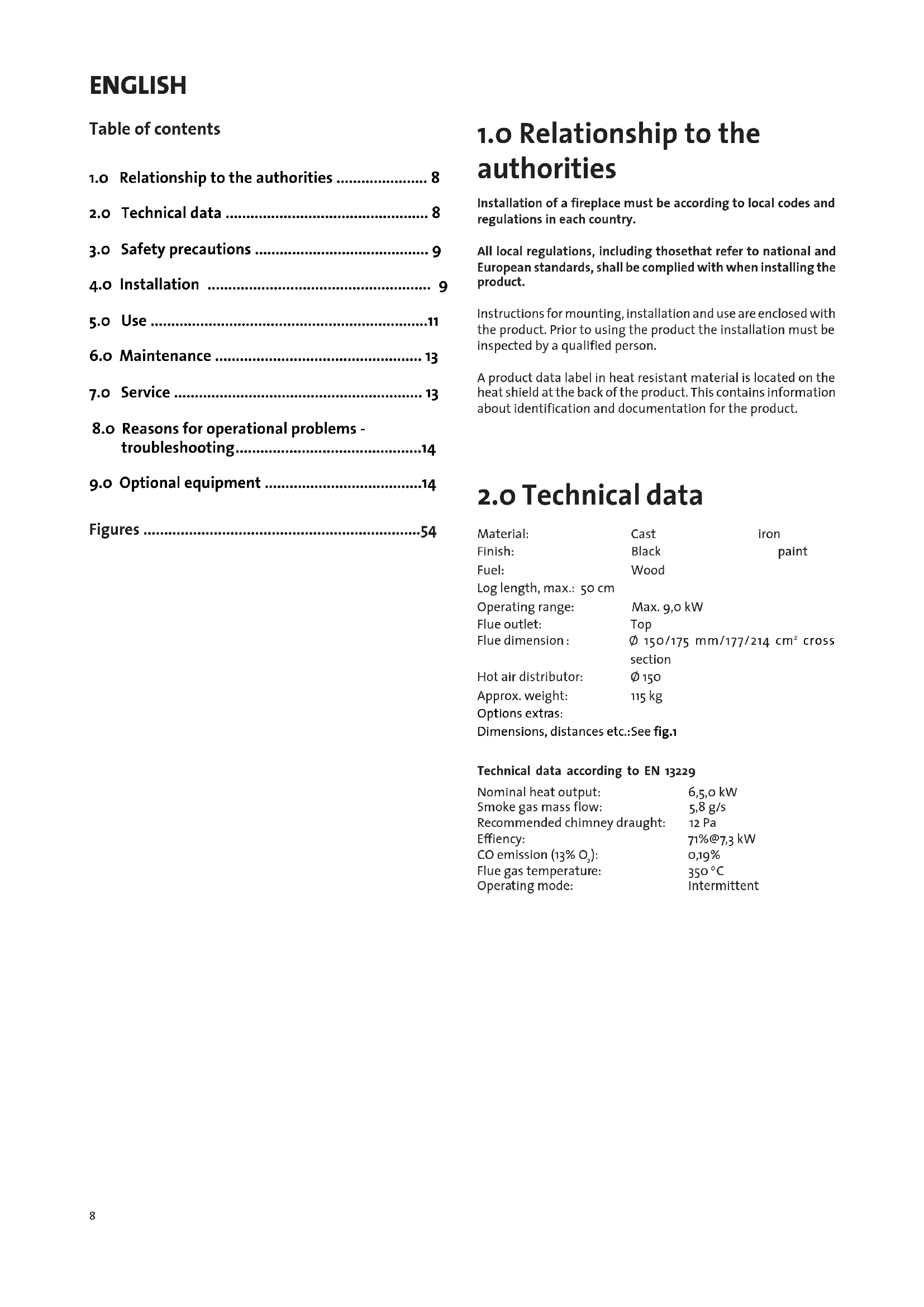 cross section Hot air distributor: Ø 150 Approx. weight: 115 kg Options extras: Dimensions, distances etc.: See fig.1 Technical data according to EN 13229 Nominal heat output: 6,5,0 kW Smoke gas mass flow: 5,8 g/s Recommended chimney draught: 12 Pa Effiency: 71%@7,3 kW CO emission (13% O