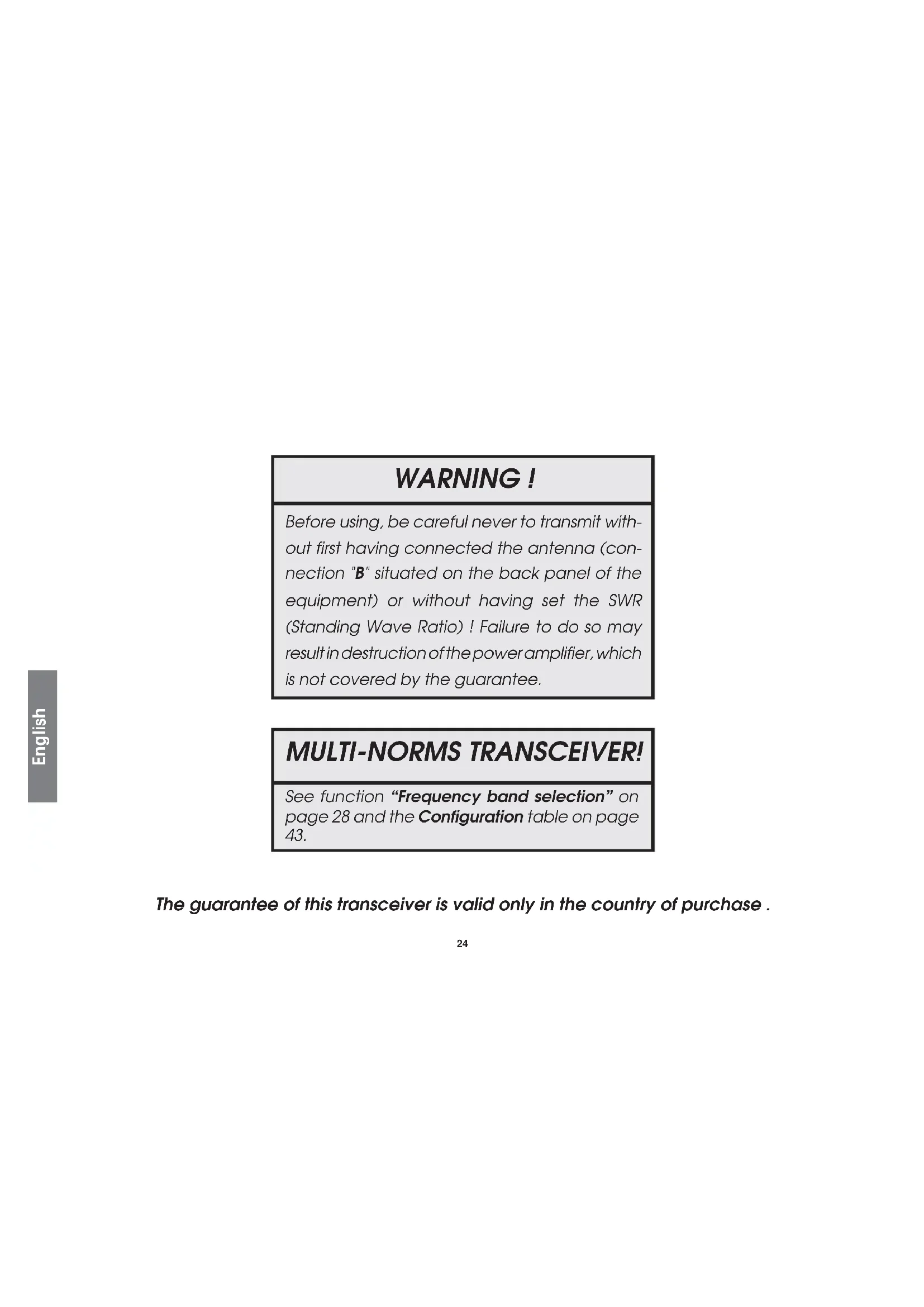 The guarantee of this transceiver is valid only in the country of purchase . English WARNING ! MULTI-NORMS TRANSCEIVER! Before using, be careful never to transmit with- out first having connected the antenna (con- nection "B" situated on the back panel of the equipment) or without having set the SWR (Standing Wave Ratio) ! Failure to do so may result in destruction of the power amplifier, which is not covered by the guarantee. See function “Frequency band selection” on page 28 and the Configuration table on page