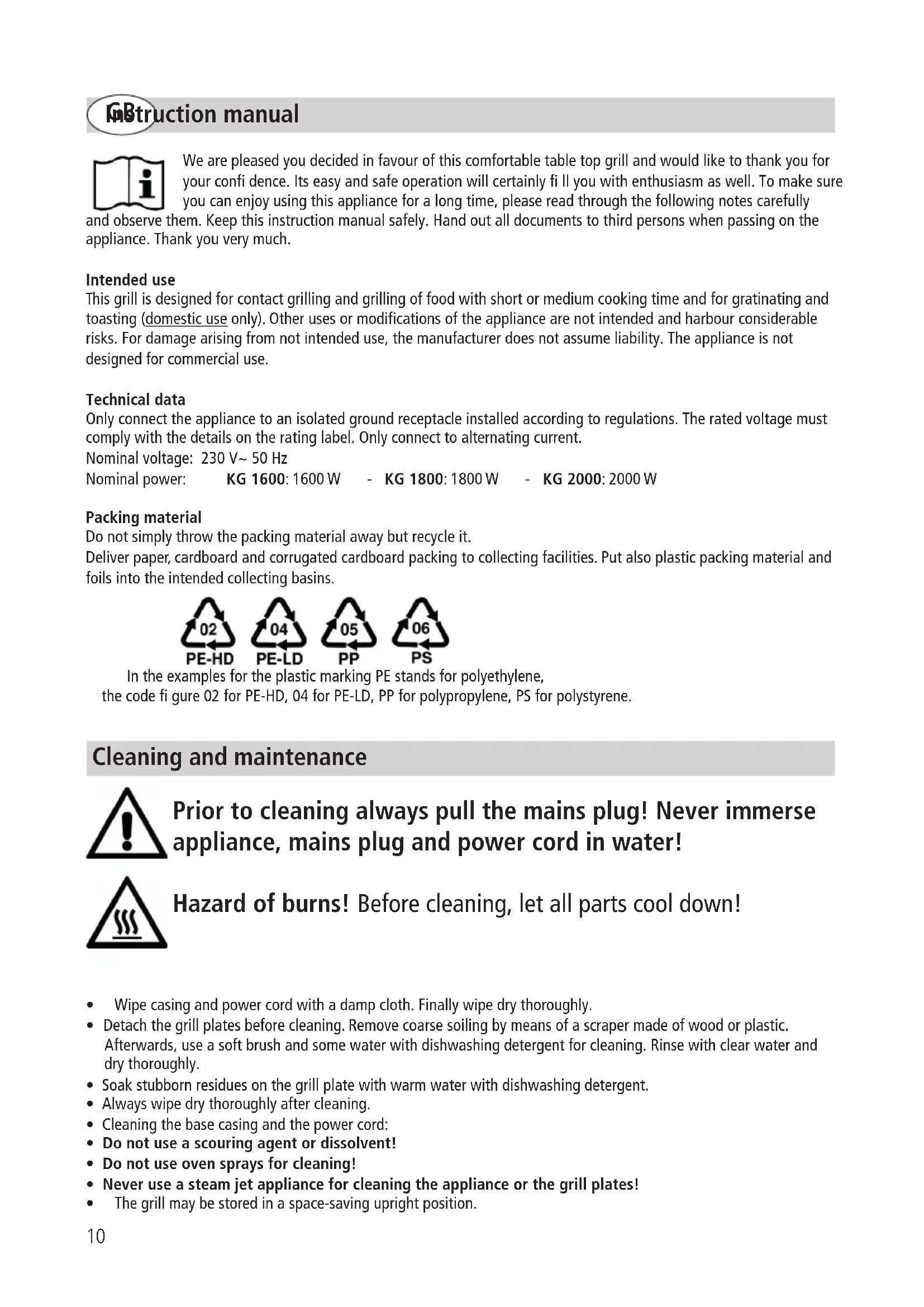 Instruction manual We are pleased you decided in favour of this comfortable table top grill and would like to thank you for your confi dence. Its easy and safe operation will certainly fi ll you with enthusiasm as well. To make sure youcanenjoyusingthisapplianceforalongtime,pleasereadthroughthefollowingnotescarefully and observe them. Keep this instruction manual safely. Hand out all documents to third persons when passing on the appliance. Thank you very much. Intended use This grill is designed for contact grilling and grilling of food with short or medium cooking time and for gratinating and toasting(domestic use only). Other uses or modifi cations of the appliance are not intended and harbour considerable risks. For damage arising from not intended use, the manufacturer does not assume liability. The appliance is not designed for commercial use. Technical data Only connect the appliance to an isolated ground receptacle installed according to regulations. The rated voltage must comply with the details on the rating label. Only connect to alternating current. Nominal voltage: 230 V~ 50 Hz Nominal power: KG 1600: 1600 W - KG 1800: 1800 W - KG 2000: 2000 W Packing material Do not simply throw the packing material away but recycle it. Deliver paper, cardboard and corrugated cardboard packing to collecting facilities. Put also plastic packing material and foils into the intended collecting basins. IntheexamplesfortheplasticmarkingPEstandsforpolyethylene, the code fi gure 02 for PE-HD, 04 for PE-LD, PP for polypropylene, PS for polystyrene.