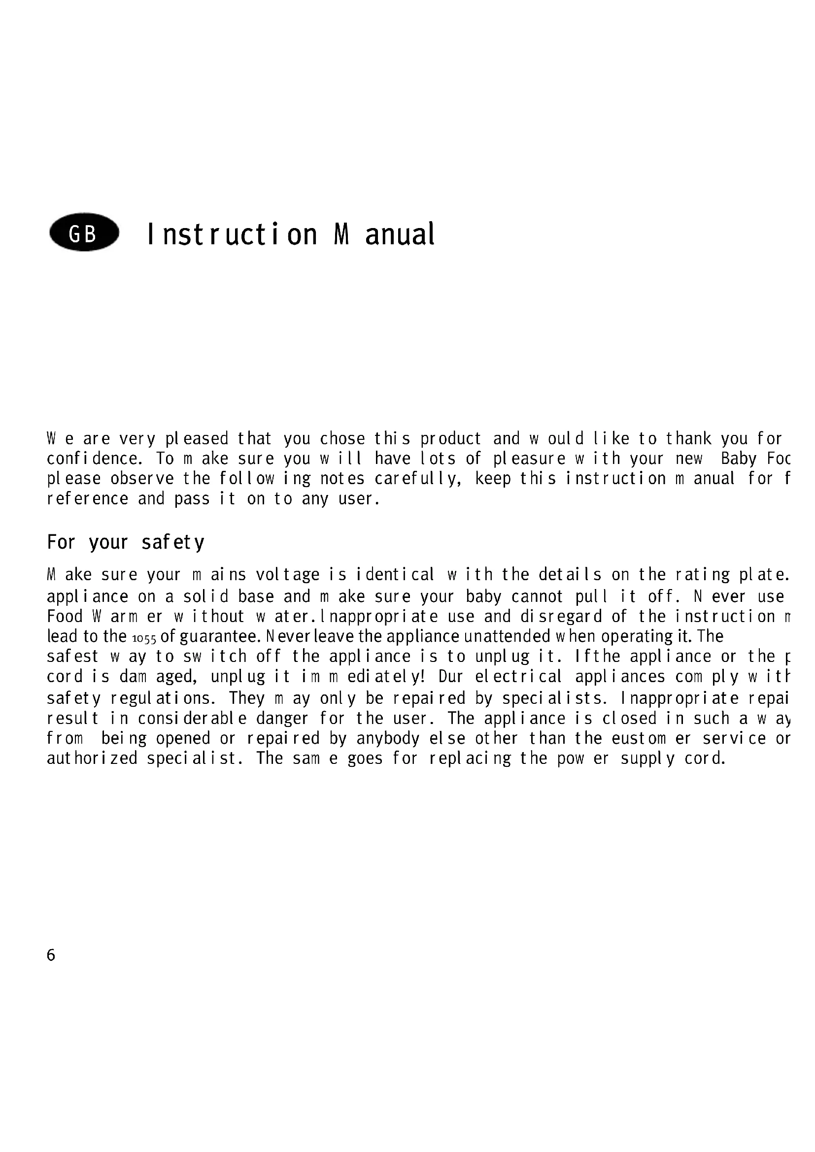 W e are very pleased that you chose this product and w ould like to thank you for your confidence. To m ake sure you w ill have lots of pleasure w ith your new Baby Food W arm er, please observe the follow ing notes carefully, keep this instruction m anual for future reference and pass it on to any user. For your safety M ake sure your m ains voltage is identical w ith the details on the rating plate. Alw ays put the appliance on a solid base and m ake sure your baby cannot pull it off. N ever use the Baby Food W arm er w ithout w ater.lnappropriate use and disregard of the instruction m anual w ill lead to the 1055 of guarantee. Never leave the appliance unattended w hen operating it. The safest w ay to sw itch off the appliance is to unplug it. Ifthe appliance or the pow er supply cord is dam aged, unplug it im m ediately! Dur electrical appliances com ply w ith the relevant safety regulations. They m ay only be repaired by specialists. Inappropriate repairs m ay result in considerable danger for the user. The appliance is closed in such a w ay to prevent it from being opened or repaired by anybody else other than the eustom er service or an authorized specialist. The sam e goes for replacing the pow er supply cord. G B7 H ow to w arm up baby bottles Put the bottle into the Baby Food W arm er, then pour w ater into the cavity betw een the bottle and the inner container. Follow ing that connect the appliance to the m ains and select the requested tem perature w ith the rotary knob. The pilot lam p goes on, and heating begins. After approxim ately 8 m inutes the right tem perature for your baby to eat is reached, the pilot lam p goes off. Now rem ove the bottle or turn the rotary knob back (refer to ,H ow to keep food w arm '). Before you give your baby som ething to drink, please m ake sure the content has the right tem perature for drinking. For this end shake the bottle a little so that heat w ill spread evenly. Sw itch off the appliance after usage by turning the rotary knob counter-clockw ise as far as it w ill go und unplug it from the m ains. Attention: W arm ing up baby food does not only depend on the selected tem perature, but also on the original tem perature of the food and the w ater, the thickness of the glass, the quantity of food and its consistency. The sym bol ,bottle' stands for heating up quickly. W ithin a short period of tim e you w ill find out w hat tem perature to select in order to obtain the right food tem perature. H ow to w arm up baby food jars Rem ove the label on the jar to m ake sure it w ill not com e off w hen heating it up and w ill not m ake the inner container sticky. Take the lid off and clip the grip clip around the thread. Then put the jar into the inner container and pour w ater into the cavity betw een the jar and the container. Position the rotary knob to the ,jar' sym bol, the pilot lam p goes on, and heating begins. In order to obtain a m ore even spreading of heat stir the content of the jar several tim es. After heating up is com pleted, the pilot lam p goes off, the selected food tem perature has been reached.8 H ow to keep food w arm W ith this appliance you can also keep baby food w arm for som e tim e; for this end position the rotary knob to the range for keeping w arm (refer to picture on page 2). How ever, for reasons of m icrobiology and hygiene baby food should never be kept w arm for longer than 1 hour. Cleaning and m aintenance Alw ays unplug the appliance prior to cleaning and let it cool. In order to avoid calcerous form ation alw ays w ipe out the Baby Food W arm er w ith a dam p cloth after usage. Do not use any detergents or abrasive detergents. Never im m erse the appliance in w ater and do not use any steam jet appliances.9 Instructions d'utilisation