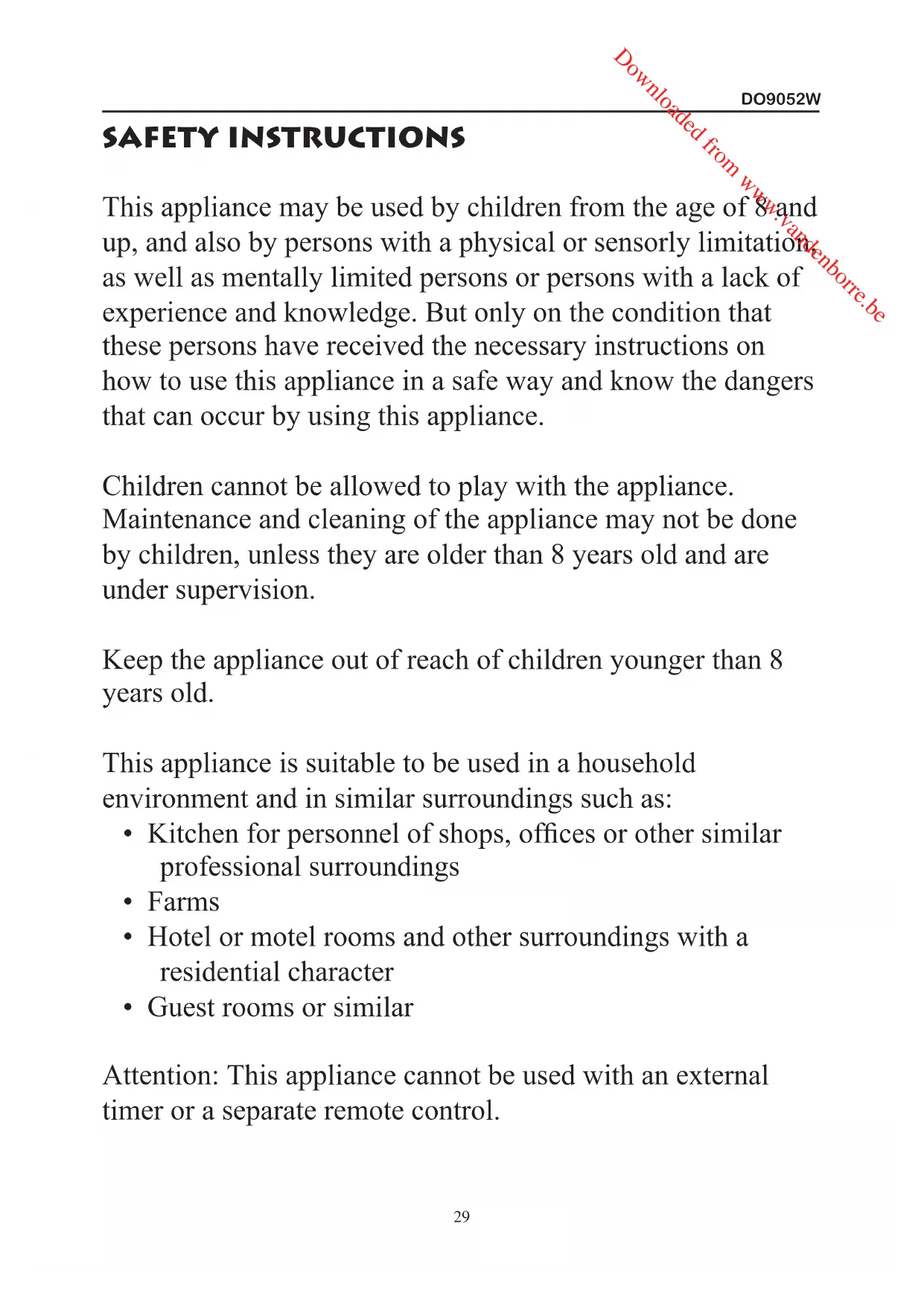 - Guest rooms or similar Attention: This appliance cannot be used with an external timer or a separate remote control. Downloaded from www.vandenborre.beDO9052W