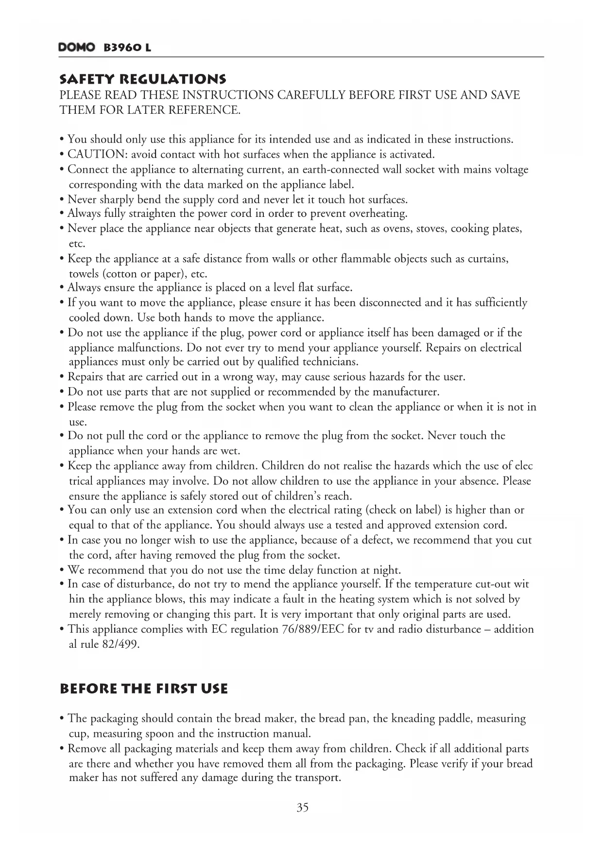 Download the instructions for your Bread maker in PDF format for free! Find your manual B3960 - DOMO and take your electronic device back in hand. On this page are published all the documents necessary for the use of your device. B3960 by DOMO.